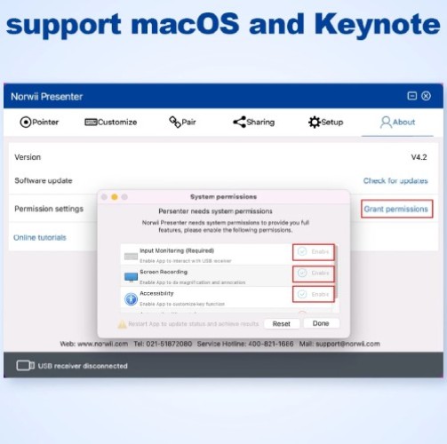 - Đèn tắt báo hiệu đã sạc đầy Bạn có thể kiểm tra pin còn nhiều hay ít trên phần mềm Norwii Presenter khi kết nối USB với máy tính . Đối với hệ điều hành MacOS: khi cài xong driver cho máy tính xong bạn cần mở phần mềm lên và cấp 3 quyền truy cập cho phần mềm để có thể sử dụng được.