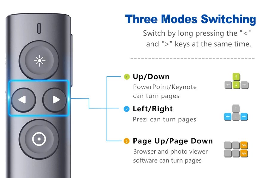 1. Tính năng: sử dụng trình chiếu, thuyết trình, word, PowerP 2. Led: màu đỏ 3. Sử dụng: Pin AAA 4. Khoảng cách chiếu Led: 100-200M 5. Khoảng cách điều khiển: sóng 2.4Ghz lên đến