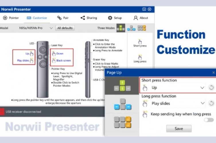 - 2 Nút trái + phải của Norwii N95s Pro dùng điều chỉnh tiến + lùi trong Slide và lên xuống khi sử dụng trung những ứng dụng khác . Cũng có thể cài đặt bút trình chiếu Norwii N95s Pro theo thói quen người sử dụng như hình dưới. Bút trình chính spotlight N95s Pro có nhiều tính năng cho bạn sử dụng. Có thể sử dụng trên màn hình led, màn hình LCD hoặc phông chiếu thông thường. Đặc biệt còn được dùng phổ biến cho việc học tập và giảng dạy Online Khoảng cách kết nối của bút trình chiếu màn hình led N95s Pro lên đến 50 Mét Khoảng cách tia laser vật lý của bút trình chiếu N95s Pro lên đến 200 Mét Bút trình chiếu kỹ thuật số N95s Pro được trang bị pin Lithium với dung lượng 300Amh có thể sạc lại.