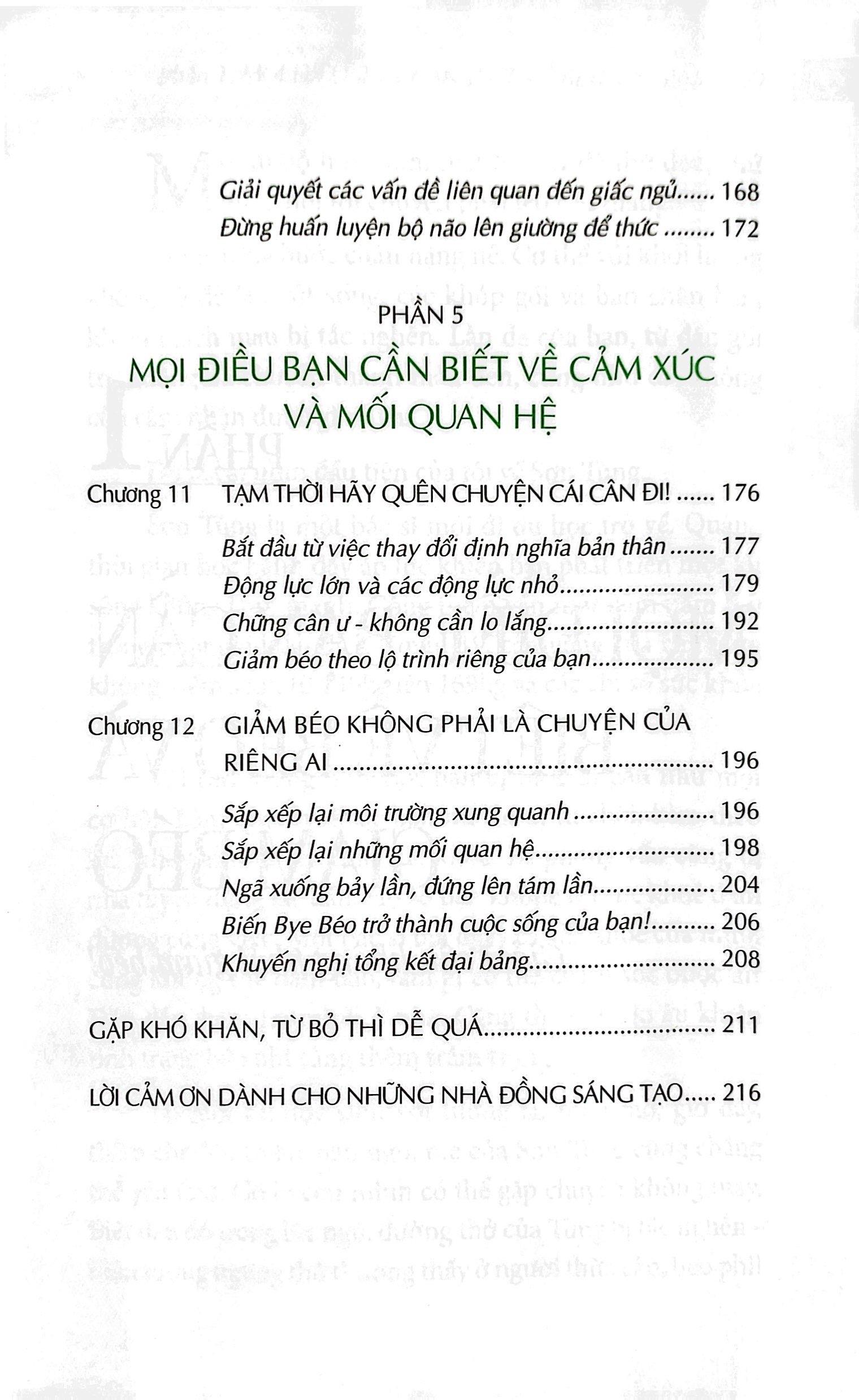 - Chương 10. Để có một giấc ngủ tốt hơn. Ru ngủ năm giác quan của bạn để có những giấc ngủ chất lượng. PHẦN 5 - MỌI ĐIỀU BẠN CẦN BIẾT VỀ CẢM XÚC VÀ MỐI QUAN HỆ Nếu không có một lý do đủ lớn, bạn sẽ không thể nào vượt qua được các khó khăn trước mắt. Sắp xếp lại cảm xúc cá nhân, môi trường xung quanh và các mối quan hệ, tạo thành một hệ thống giúp bạn sống một cách khỏe mạnh và giảm béo thành công.