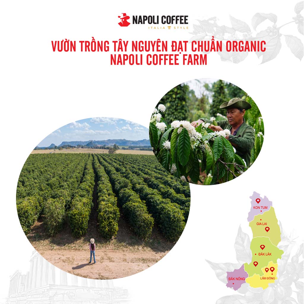 Sản phẩm đạt chuẩn FDA, ISO 22000:2018 • NAPOLI - 26 NĂM PHỤC VỤ TẠO NÊN UY TÍN VÀ CHẤT LƯỢNG CAO => Hạt cà phê Robusta và Arabica được canh tác, thu hoạch và chế biến khép kín trên nông trại của Napoli, đảm chất lượng tuyệt đối, kèm với công nghệ rang mộc, chết biến hiện đại theo công thức độc quyền của nhà sáng lập. Vì thế chất lượng của ly cà phê sau khi pha đảm bảo nguyên bản và giá luôn rẻ nhất trên thị trường