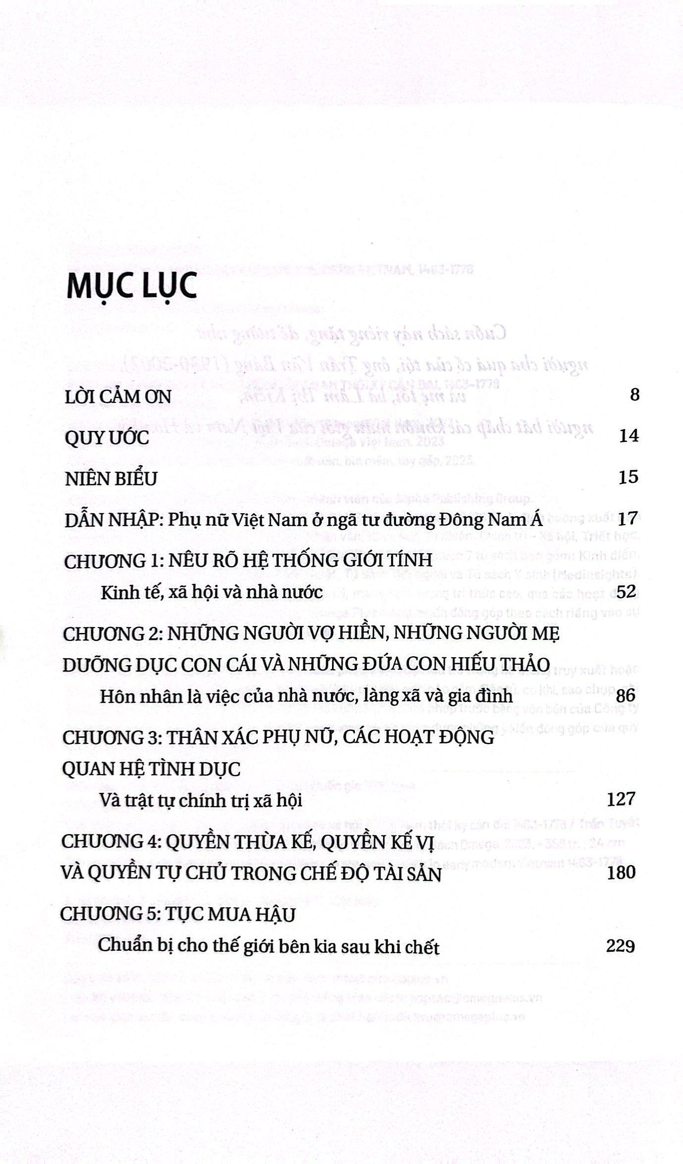 Cuốn sách Các thành tố gia đình: Giới tính, chính quyền và xã hội ở Việt Nam thời kỳ cận đại, 1463-1778 của tác giả Trần Tuyết Nhung gồm 6 chương, phân tích các nội dung:
