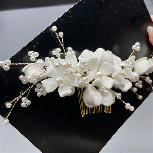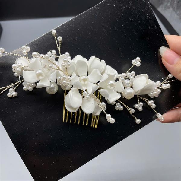 Trâm cài tóc cô dâu thiết kế ngọc trai và hoa 5 canh mềm mại, nữ tính. Tôn lên vẻ đẹp cho mái tóc xinh. Thích hợp trang điểm, make up cô dâu, trang điểm