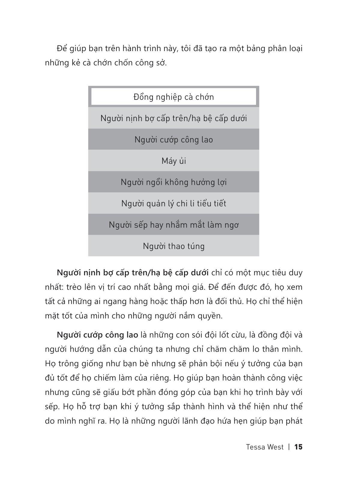 Cẩm Nang Chuyên Trị Đồng Nghiệp Cà Chớn Khi đối mặt những đồng nghiệp cà chớn, kể cả người có kinh nghiệm làm việc dày dặn cũng thường trở nên vô dụng. Dù học cao đến đâu hay chức vụ là gì, ta đều có thể trở thành nạn nhân của những kẻ này khi không có kỹ năng quản lý và giải quyết mâu thuẫn chốn công sở. Vẫn biết né tránh không phải là giải pháp, thế nhưng chúng ta lại thường có xu hướng tránh đối đầu thay vì giải quyết xung đột. Để giải mã lý do và vượt qua rào cản tâm lý, CẨM NANG CHUYÊN TRỊ ĐỒNG NGHIỆP CÀ CHỚN sẽ giúp bạn đi sâu vào “điều tra” các kiểu đồng nghiệp tồi và tìm ra phương pháp ứng phó hiệu quả. Đôi khi chiến lược không đòi hỏi cao siêu hay buộc bạn phải đối đầu trực tiếp. Dù là người mới đi làm đang gặp khó khăn trong công việc, là quản lý hay thành viên của các hội nhóm, cuốn sách này sẽ là một kim chỉ nam giúp dân văn phòng sinh tồn chốn công sở. Có rất nhiều ví dụ hàng ngày và các chiến lược thông minh được đưa ra trong cuốn sách này, chẳng hạn như: