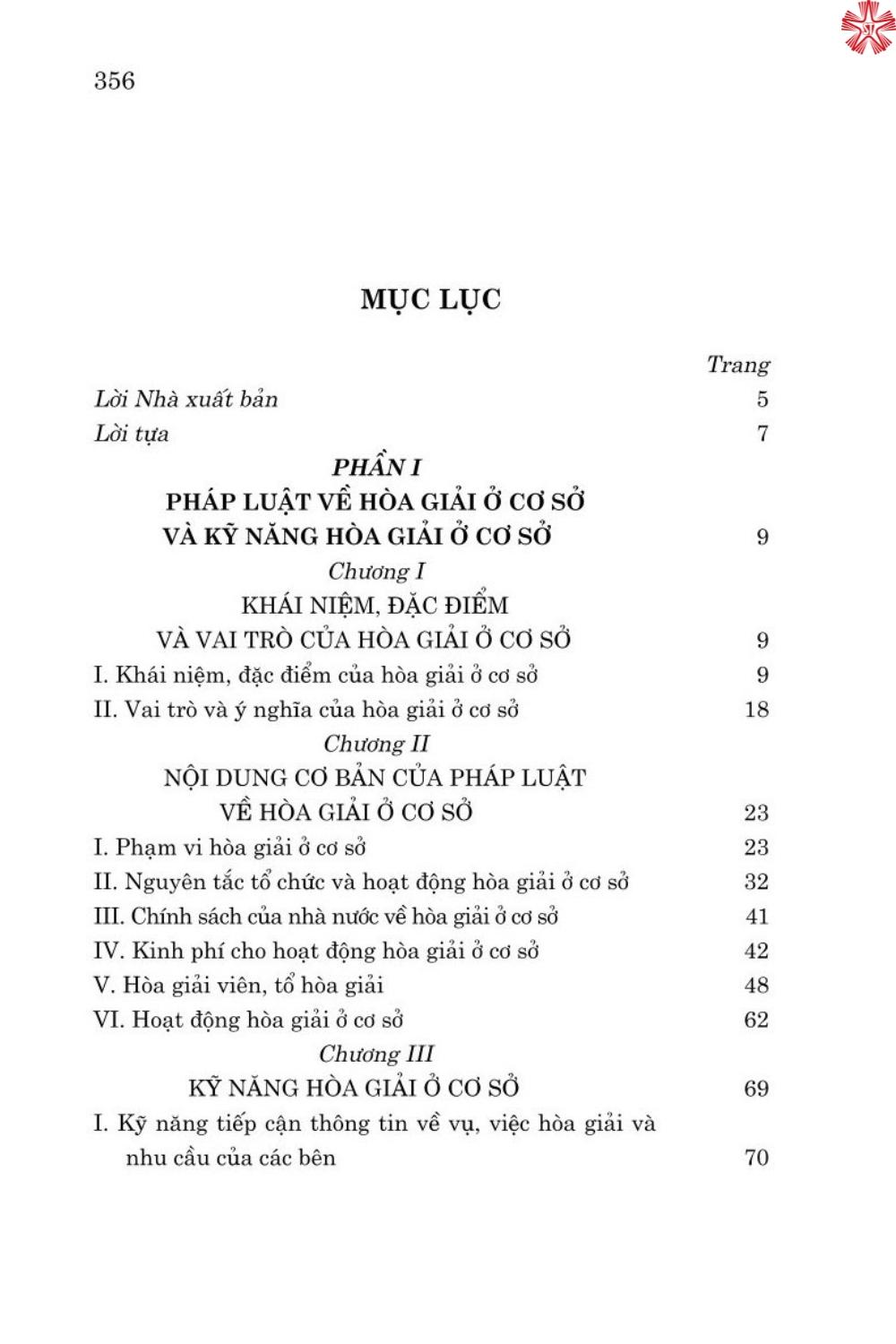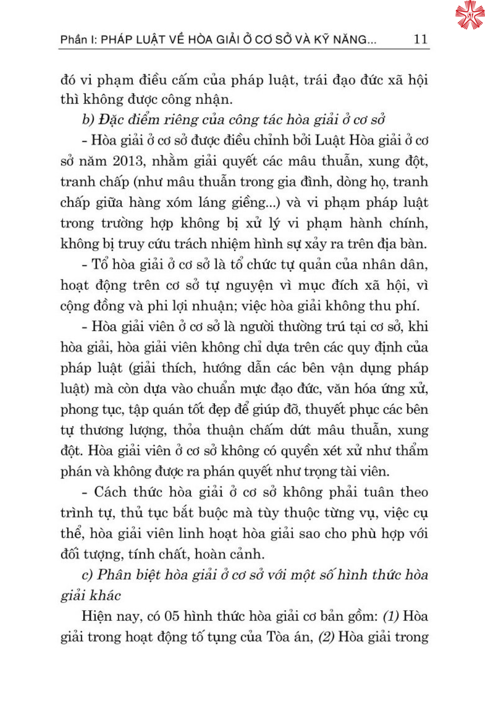 Cuốn sách cung cấp nhiều thông tin về vấn đề hòa giải như: cách hiểu, mục đích, vai trò, ý nghĩa, cơ sở chính trị, pháp lý, phạm vi của công tác hòa giải ở cơ sở; về các vấn đề liên quan đến tổ hòa giải và tổ viên hòa giải; về hoạt động công tác hòa giải: ai được tham gia hòa giải, hòa giải được tiến hành như thế nào, ở đâu, khi nào; về kỹ năng hòa giải ở cơ sở: kỹ năng giao tiếp, kỹ năng nghe, hòa giải, yêu cầu các bên cung cấp chứng cứ, tài liệu liên quan đến vụ việc, kỹ năng tra cứu tài liệu tham khảo, kỹ năng giải thích, thuyết phục, cảm hóa, hướng dẫn các bên tự nguyện giải quyết tranh chấ Ngoài ra, cuốn sách cũng trích dẫn một số văn bản pháp luật về tổ chức hòa giải và hoạt động hòa giải ở cơ sở .