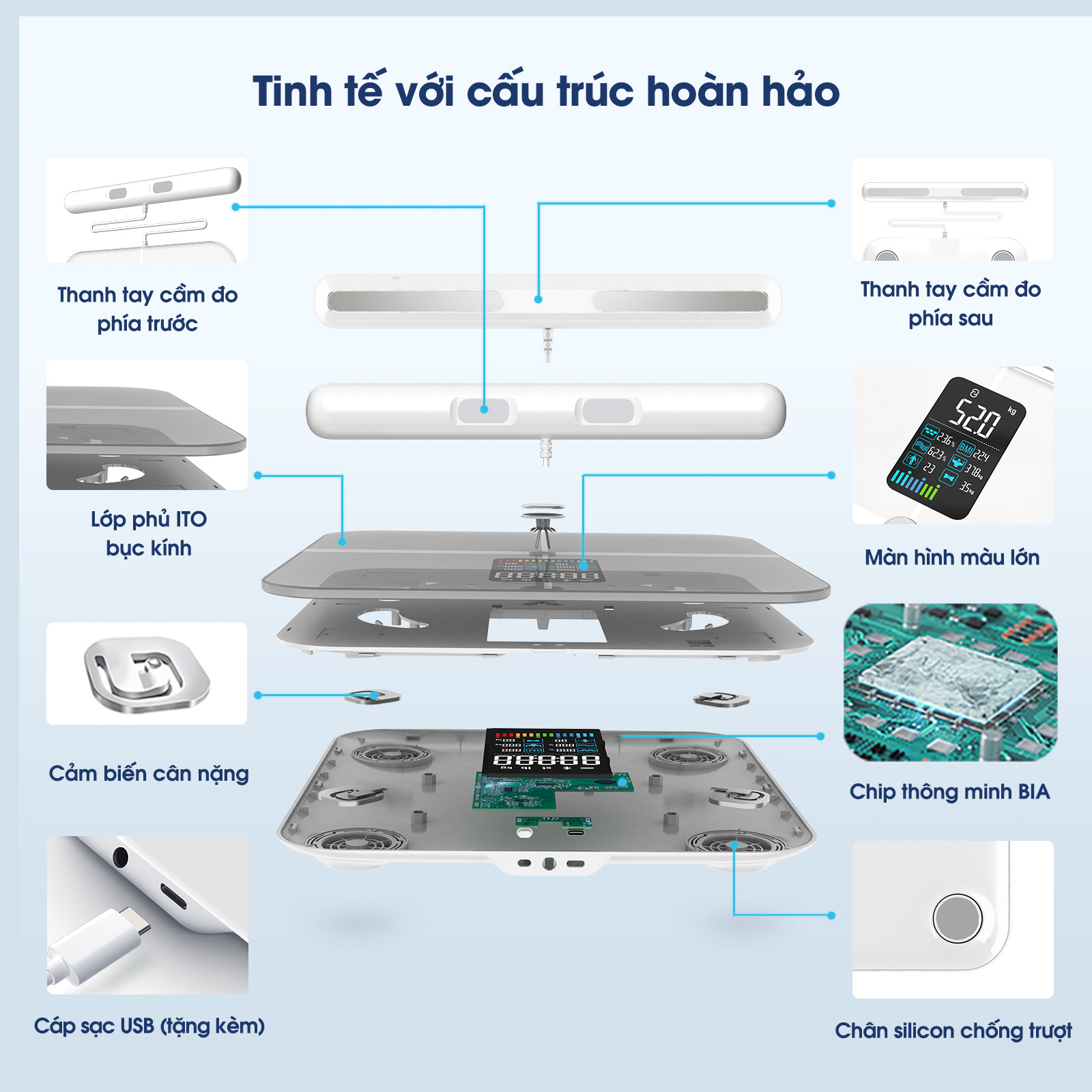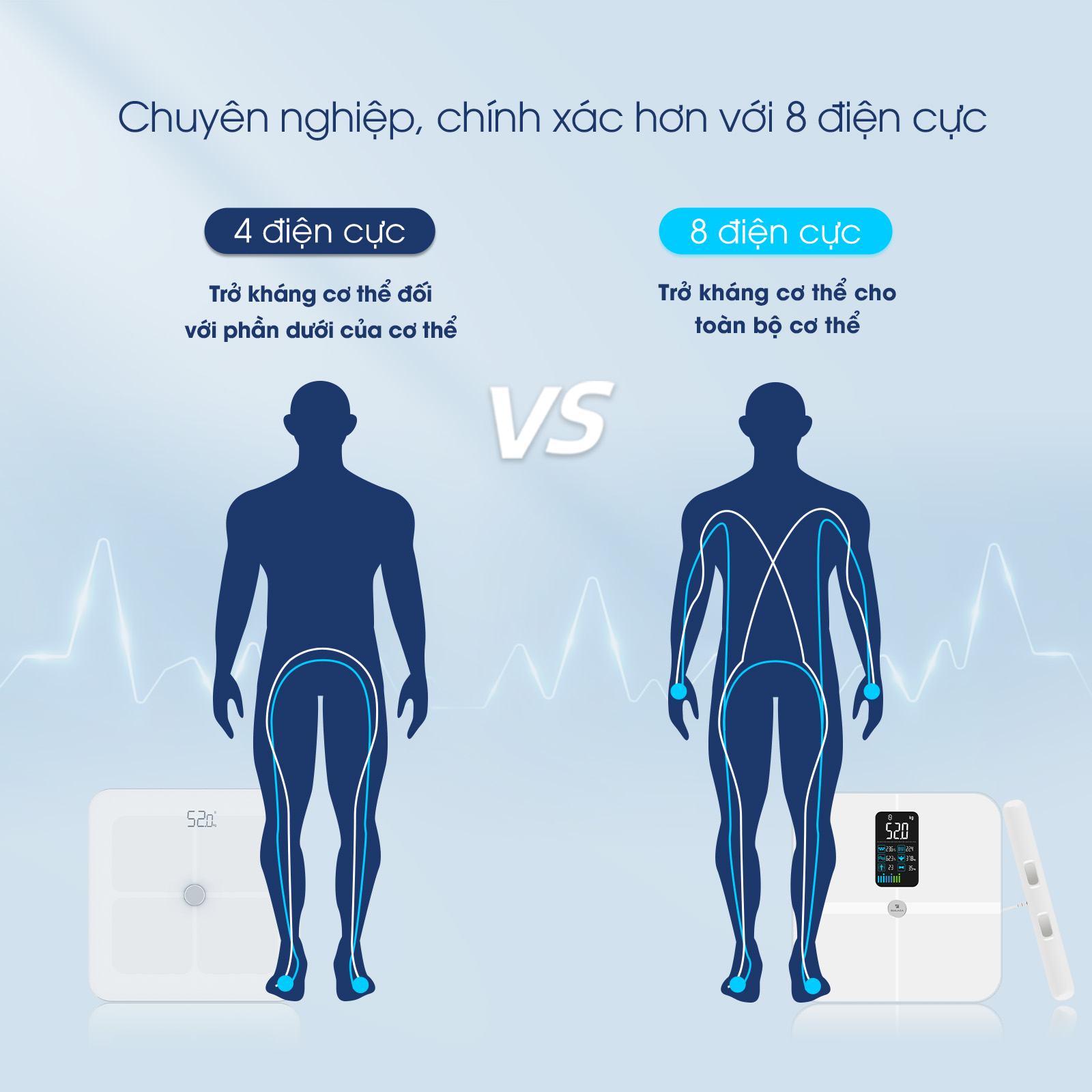 - Thay vì sử dụng kỹ thuật 4 điện cực chỉ đo được nửa người bên dưới, cân sử dụng công nghệ đo 8 điện cực đo toàn thân cho độ chính xác cao hơn và dữ liệu phân tích nhiều hơn với 30 dữ liệu