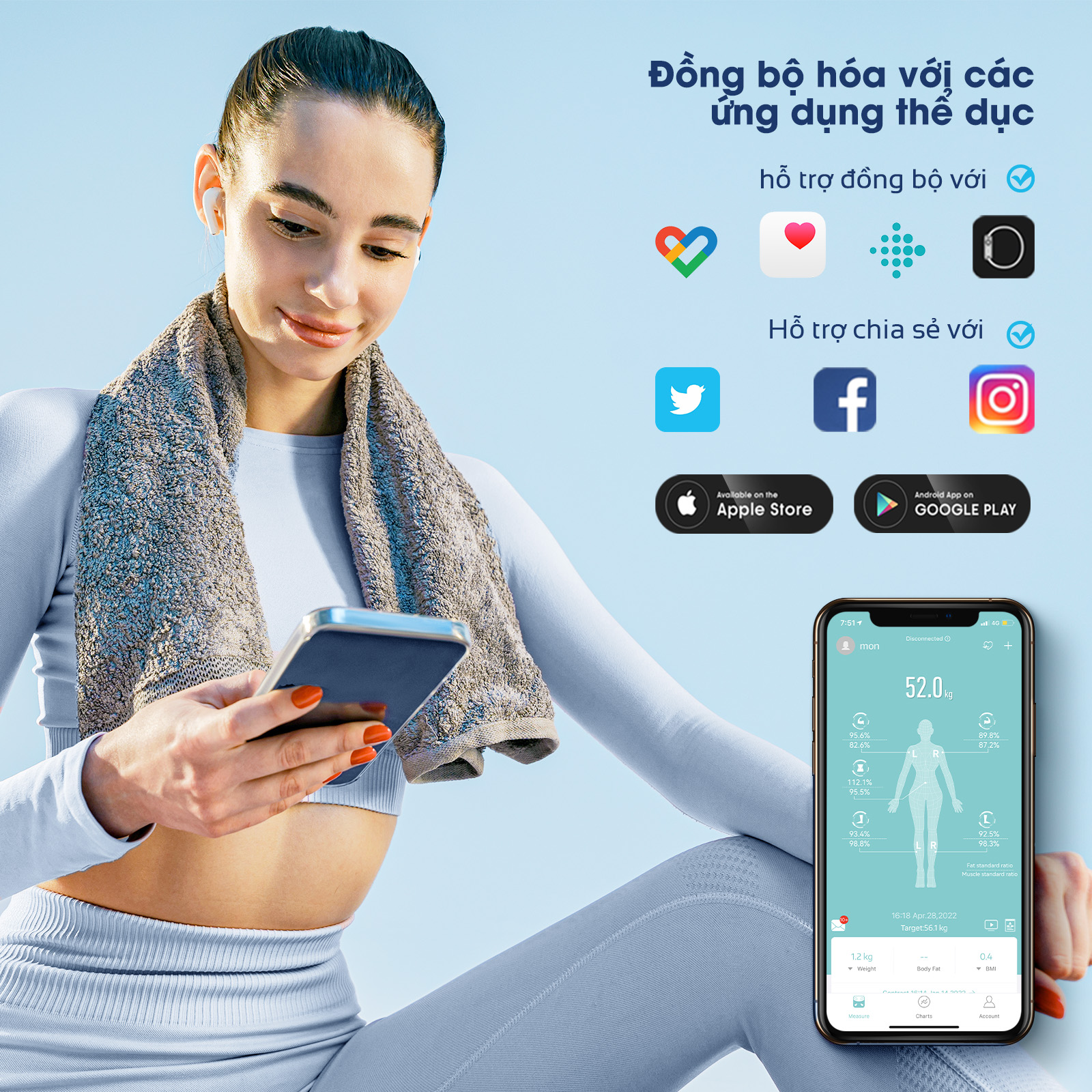 - DỄ DÀNG KẾT NỐI & TỰ ĐỒNG BỘ VÀ IN BÁO CÁO DỮ LIỆU TRÊN APP: Kết nối Smartphone thông qua Bluetooth với ứng dụng Fitdays, hiển thị KQ đo trực tiếp ngay khi bạn đứng lên cân. Ngoài ra cân còn có chứng năng kết nối với máy tin để xuất văn bản dữ liệu sức khỏe cơ thể của bạn một cách chuyên nghiệp