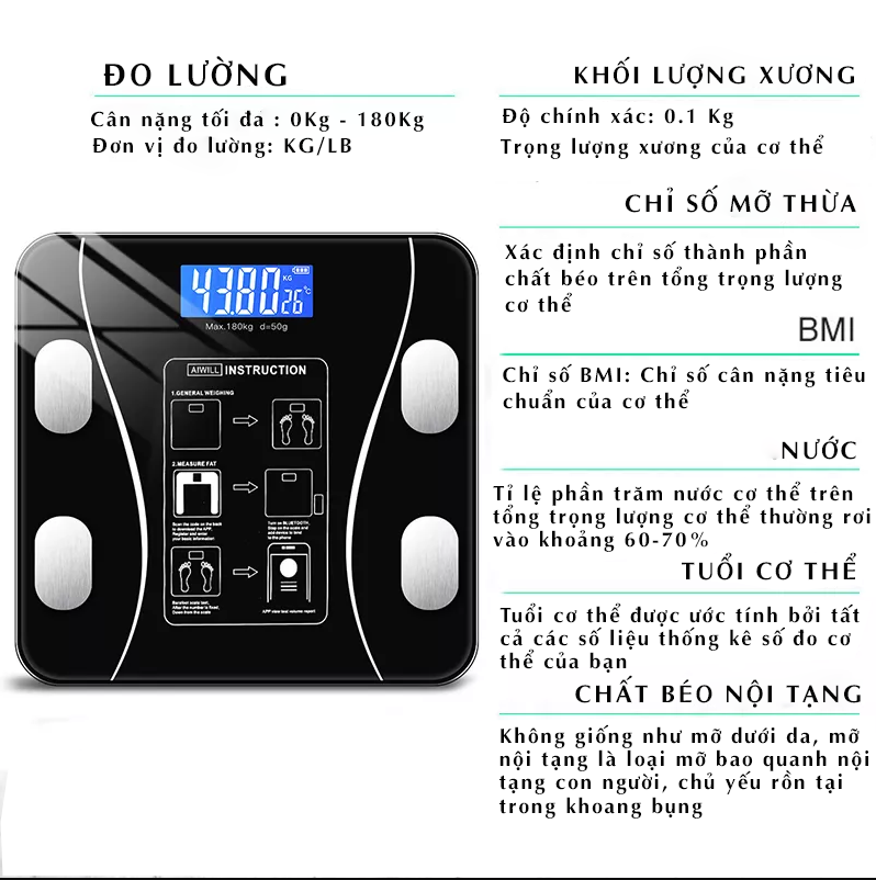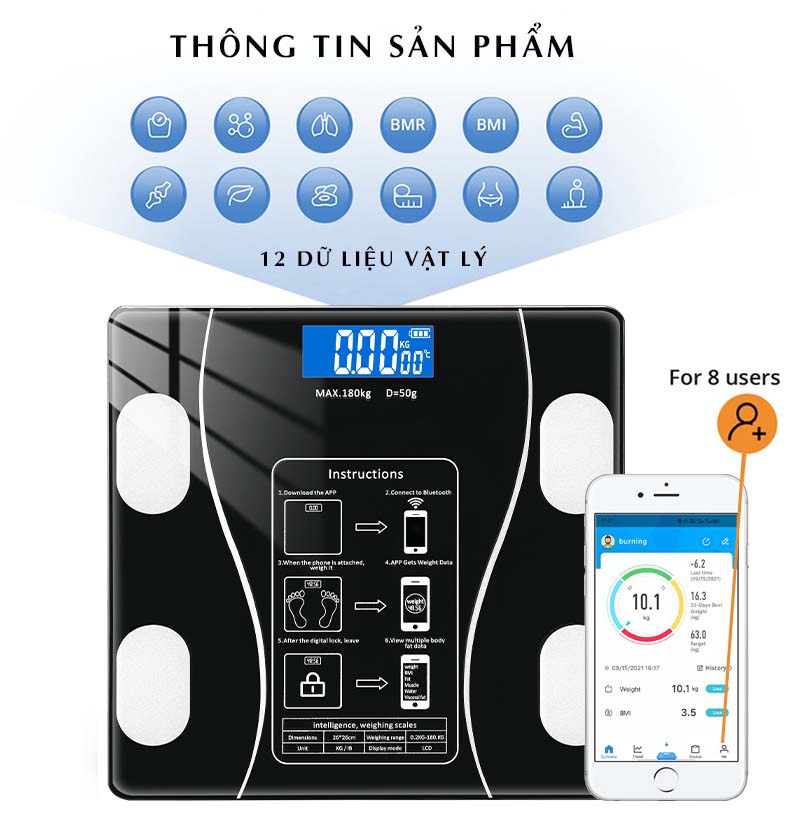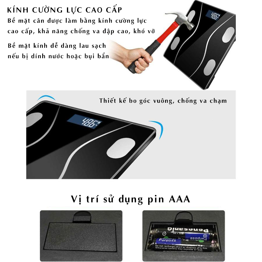 Cân điện tử thông minh đo chỉ số trên điện thoại - đo 18 chỉ số kết nối Bluetooth tiện lợi