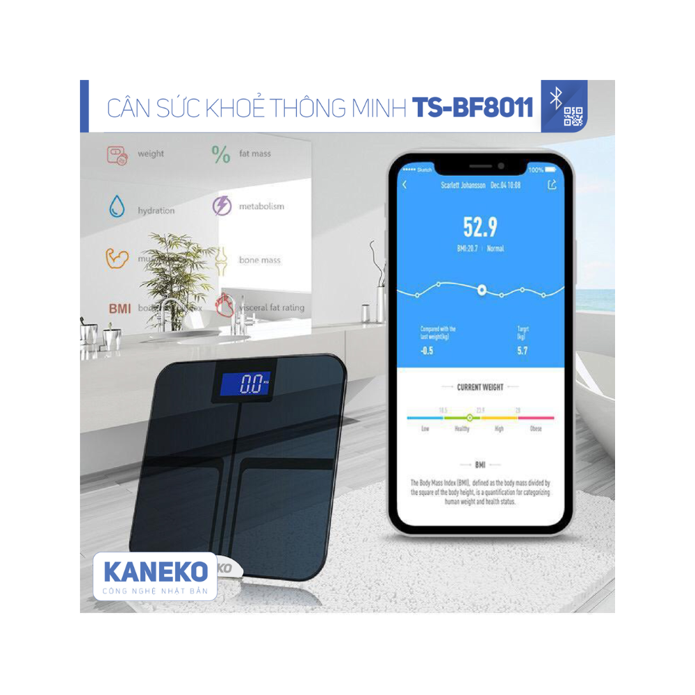 Mua tại Tiktok- Cân sức khỏe thông minh điện tử KANEKO TSBF8011 kết nối bluetooth vào điện thoại di động, Ipad cung cấp đầy đủ các chỉ số cơ thể như: