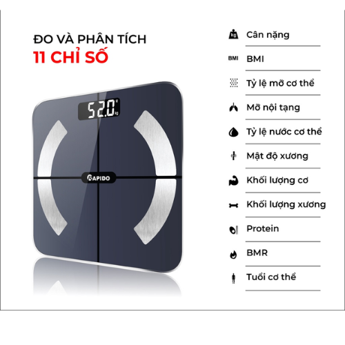 MÔ TẢ SẢN PHẨM Cân Sức Khỏe Thông Minh Rapido RSB04-S (Có bluetooth) - Hàng Chính Hãng - Bảo Hành 12 Tháng Cân sức khỏe thông minh Rapido RSB04-S điều khiển bằng Bluetooth là giải pháp đơn giản giúp bạn và các thành viên gia đình hiểu hơn về cơ thể mình. Sở dĩ cân sức khỏe thông minh Rapido RSB04-S được đánh giá cao vì – Cân sử dụng cảm ứng lực với độ chính xác cao – Dễ dàng sử dụng – Ứng dụng phù hợp với nhiều dòng máy khác nhau. Ngoài chức năng cân nặng, Rapido RSB04-S còn có thể đo được 16 chỉ số bao gồm: Cân nặng, BMI, Tỉ lệ mỡ cơ thể, Tốc độ cơ bắp,