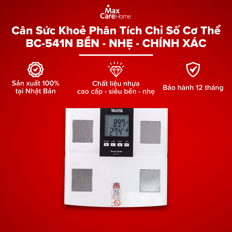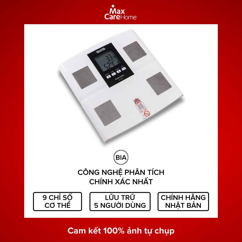 - Áp dụng tới ngày: 31/12/2022 TANITA BC-541N: Chiếc cân "Made in Japan" bền bỉ, hiện đại BC-541N là chiếc cân được sản xuất 100% tại Nhật Bản với thiết kế truyền thống với điện cực kim loại và chất lượng gia công tốt nhất. BC-541N là mẫu cân bền bỉ, chính xác mà gia đình bạn có thể sở hữu ngay lúc này. Sử dụng công nghệ quét InnerScan cùng khả năng phân tích lưỡng tần chính xác và tiên tiến nhất. Giúp bạn luôn theo sát được quá trình tập luyện thông qua 09 chỉ số, để nhận ra ngay tác động thực của chế độ ăn uống và chương trình luyện tập mỗi ngày. Kết quả sẽ hiển thị trên màn hình LCD với đèn nền dễ quan sát và bộ nhớ tự động cho 5 người dùng riêng biệt. Thông số kỹ thuật Thông số kỹ thuật Tính năng Các chỉ số phân tích Dải cân 150kg Tự động nhận diện Cân nặng Bước đo 100g Gọi lại kết quả Tỷ lệ mỡ % Lượng dải tần 02 tần Lịch, thời gian - Tỷ lệ nước cơ thể % Chế độ khách Khối lượng cơ Chế độ vận động viên Xếp loại vóc dáng Bộ nhớ người dùng 05 Khối lượng xương Lượng calo hàng ngày DCI - Tỷ lệ trao đổi chất cơ bản BMR Tuổi chuyển hóa Chỉ số cơ thể BMI - Mỡ nội tạng Tỷ lệ mỡ 5 vùng cơ thể - Tỷ lệ cơ 5 vùng cơ thể - Thiết bị chống chỉ định với người có gắn thiết bị điều hòa nhịp tim hay bất kỳ thiết bị điện tử trên cơ thể. Phụ nữ mang thai chỉ sử dụng chức năng đo cân nặng. Lý do bạn nên lựa chọn cân phân tích của TANITA Độ chính xác và tin cậy Y khoa Các chuyên gia tin tưởng sử dụng Cam kết với sức khỏe cộng đồng Với hơn 25 năm nghiên cứu khoa học y khoa, công nghệ BIA của TANITA đã luôn dẫn đầu và được chứng minh lâm sàng là công nghệ chính xác nhất. Không một ai khác có thể cung cấp sự chính xác, tin cậy và hoàn hảo như TANITA đem lại. Khi nhắc tới thiết bị theo dõi sức khỏe. TANITA luôn là lựa chọn đầu tiên với các chuyên gia. Những huấn luyện viên thể thao, cán bộ y tế, nhà khoa học và các thương hiệu toàn cầu luôn biết rằng họ có thể đặt niềm tin vào TANITA với các tiêu chuẩn khắt khe nhất. Chúng tôi có thể làm điều tương tự cho bạn. Không chỉ là phân tích, chúng tôi quan tâm tới sự tự chủ cho tất cả mọi người để cải thiện sức khỏe bản thân, dù bạn chỉ là một cá nhân hay tập thể. Bên cạnh đó, Tanita tài trợ các dự án nghiên cứu y học trên toàn cầu, đóng góp cho sự hiểu biết của nhân loại để có một cuộc sống khỏe mạnh và tốt đẹp hơn.