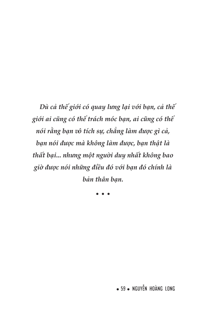 Mình Phải Sống Thật Trọn Vẹn Mỗi Ngày ------------ BE YOURSELF. Hãy là chính mình. Tôi đã từng không mảy may nghi ngờ và hoàn toàn đồng ý, khẳng định một cách vô điều kiện về câu nói này. Tôi nghĩ rằng không thay đổi bản thân theo tiêu chuẩn của thế gian, không quan tâm đến cái nhìn của người khác và sống đúng với con người thật của mình chính là cách sống tuyệt vời nhất. Thế nhưng cuộc đời vốn dĩ chẳng hề đơn giản như vậy. Nhiều năm qua, tôi đã luôn đau đáu câu hỏi sống với con người thật của mình là sống như thế nào, và tôi nhận ra rằng trong đó có biết bao yếu tố phức tạp đan xen. Tôi đã không còn có thể định nghĩa một cách đơn giản rằng sống là chính mình là sống như mình muốn, theo cảm xúc và nhu cầu của bản thân, theo phong cách và hoài bão của riêng mình nữa. Cuộc sống là quá trình tiếp nhận những thử thách bên ngoài, đau đáu suy nghĩ và giác ngộ để rồi gọt giũa bản thân. Tôi cũng nhận ra một sự thật rằng cuộc đời này rất cần dũng khí để có thể áp dụng định nghĩa “sống là chính mình” theo cách mới mẻ. Trong những khoảng thời gian vừa bất an vừa mãn nguyện, vừa lo sợ vừa háo hức, tôi đã cố gắng tìm ra một cách sống thật sự phù hợp với bản thân mình. Tôi đã có thể đối diện với những cảm xúc phức tạp, có cả tự hào, thất vọng, đan xen tham vọng về bản thân và từ bây giờ tôi đã sẵn sàng chấp nhận sự thay đổi, tôi sẽ là chủ nhân rộng lương hơn và bao dung hơn với chính mình. Tôi sẽ sống thật trọn vẹn mỗi ngày cho đến khi rời khỏi thế gian này. Trích dẫn hay trong sách: - “Tuy có đau đớn nhưng chúng ta vẫn phải tiến về phía trước. Bản thân với sống với những nỗi nhớ về quá khứ đã qua và mơ về tương lai sắp tới chính là sự tiến bước.” - “Dưới bầu trời này, không có gì mãi luôn mới mẻ nhưng lại luôn có những cách nhìn mới mẻ về những điều đã cũ.” - “Không có quy tắc nào buộc ta phải luôn đi thẳng. Đôi khi đi vòng tròn, đi từ phải sang trái, đôi lúc là chấm ra điểm xuất phát mới, thỉnh thoảng ta cũng có thể vẽ ra đường chéo để đi theo, đó chính là cuộc đời.”