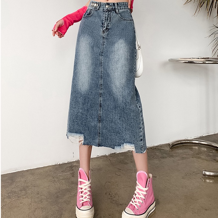 [CAO CẤP] Chân váy jean qua gối rách lai C065 dáng suông wax xanh xám không co dãn