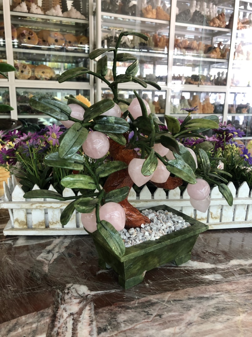 Chất liệu: Quả đào bằng đá thạch anh hồng, lá và chậu cây là đá ngọc Ấn Độ Bao gồm: 28 quả Kích thước: Cao 50 cm x Ngang 34 cm Khối lượng: 6 kg