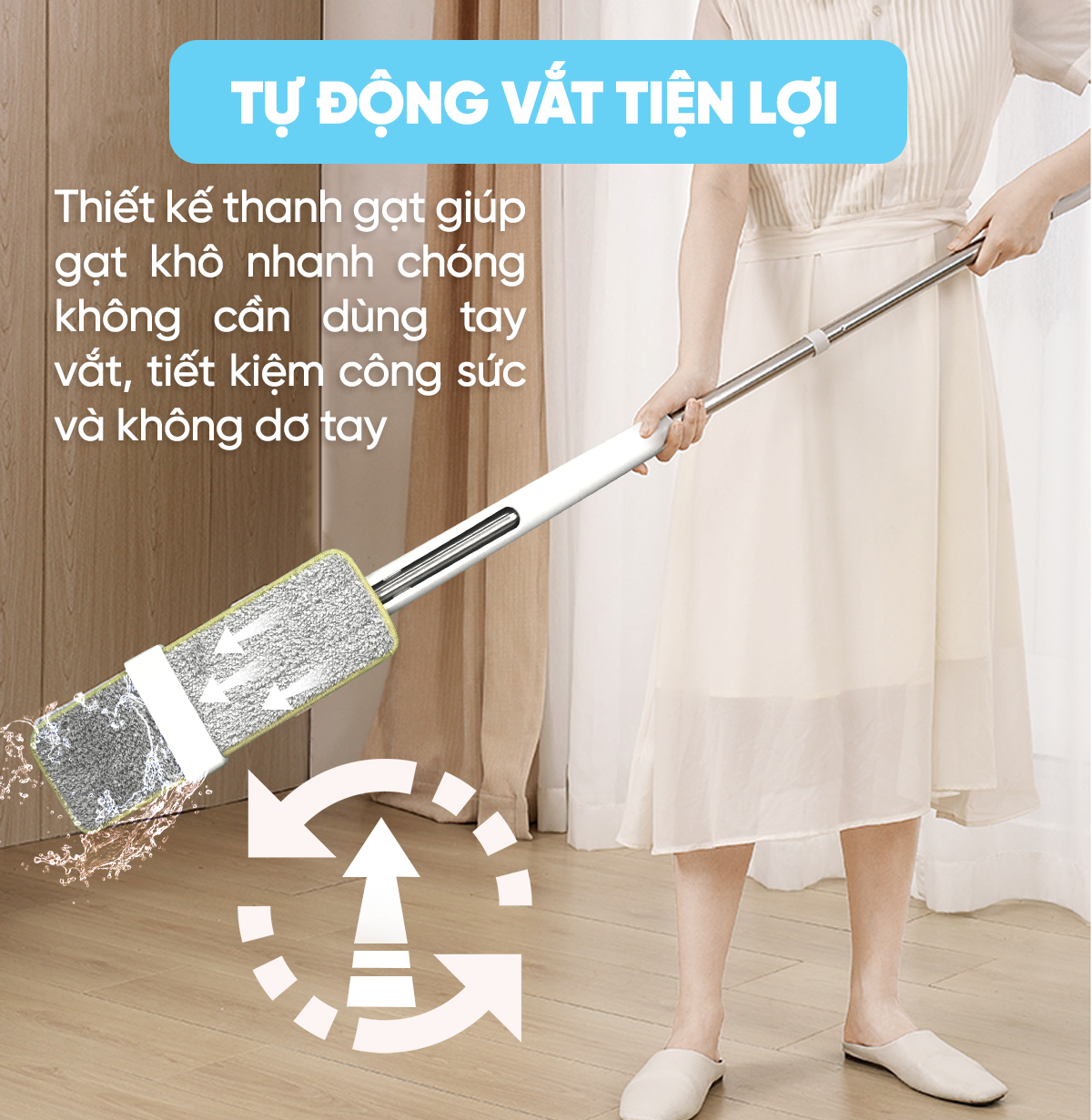Trước đây, chúng ta thường dùng giẻ và xô để lau những giọt nước trên sàn nhà và tường sơn, nhưng để lau những giọt nước nhiều, chúng ta phải dùng tay vắt giẻ nhiều