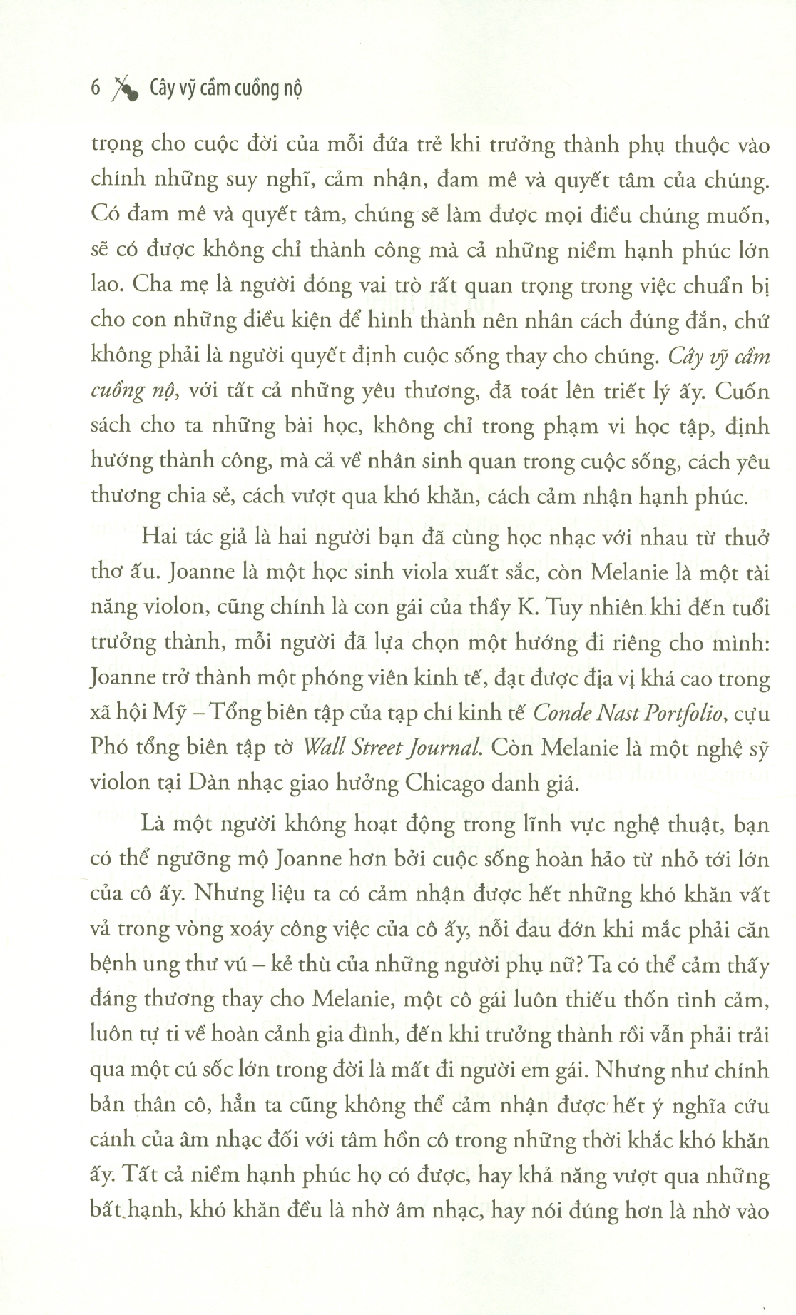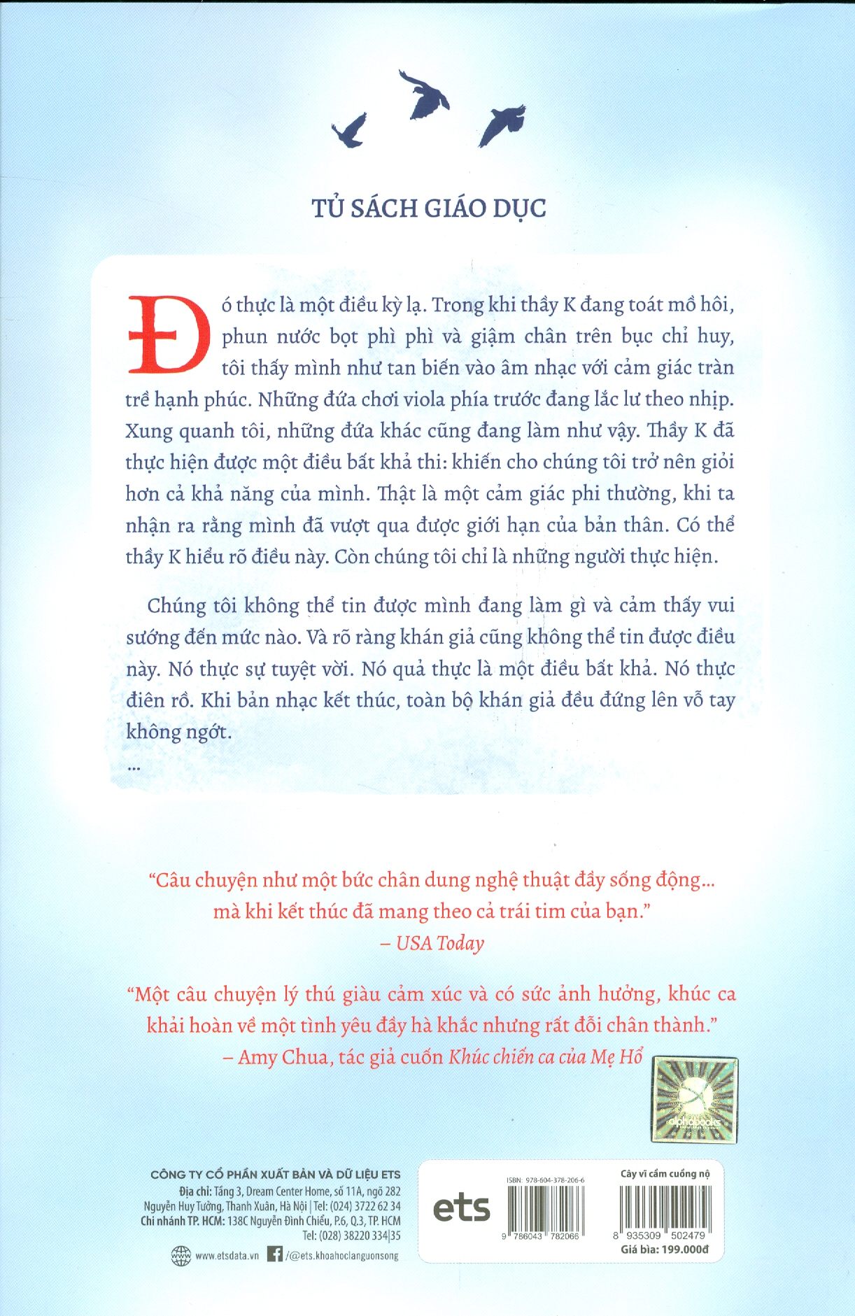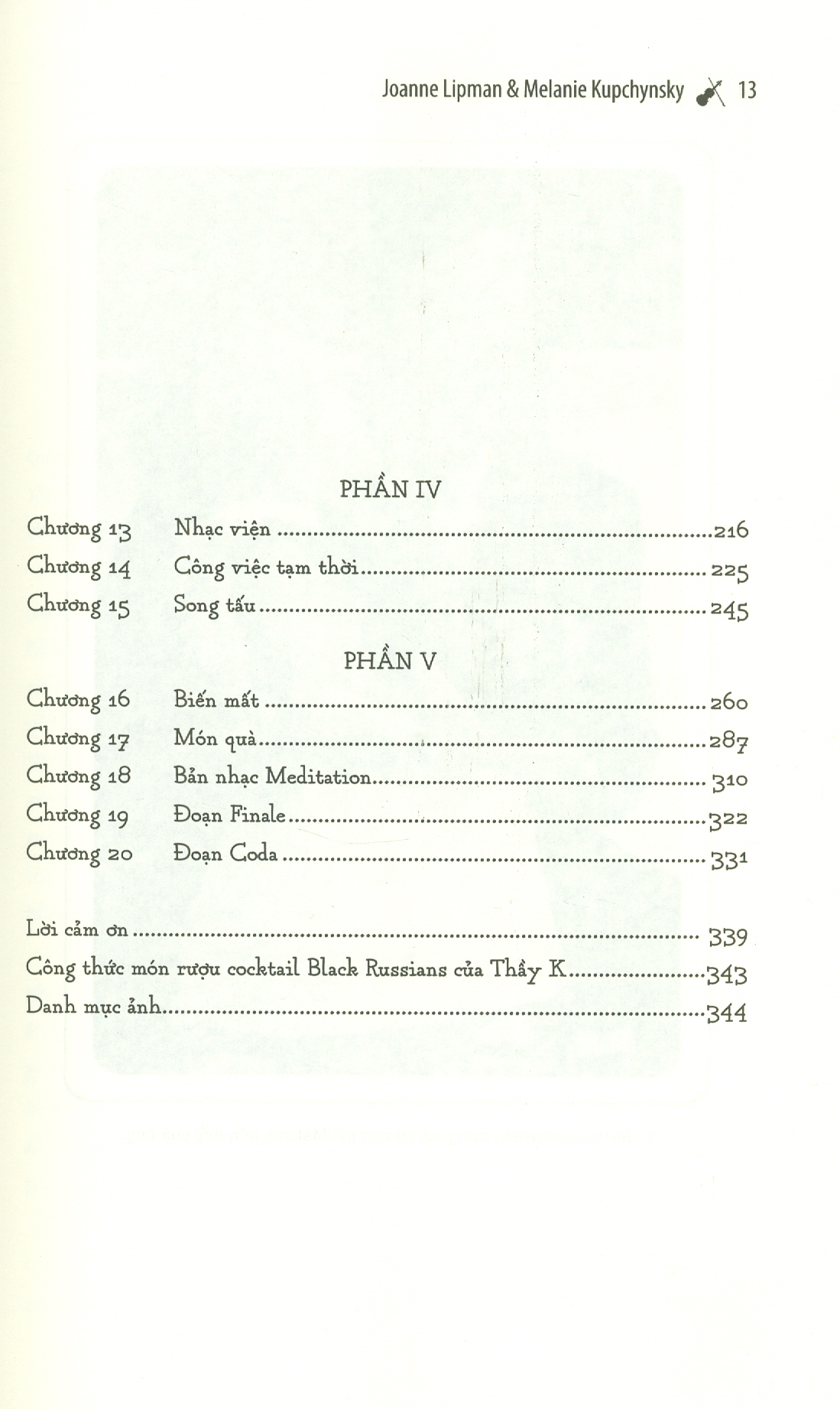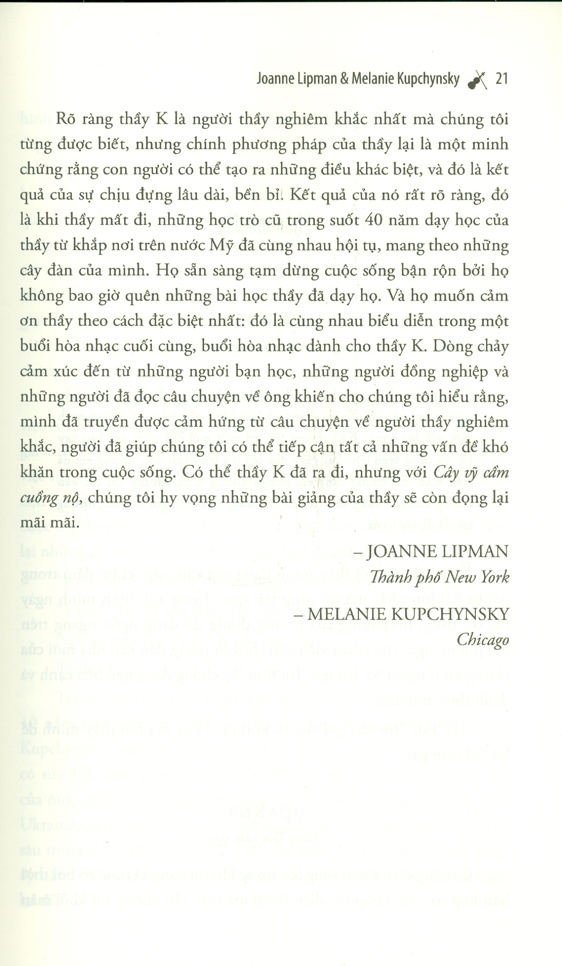 Đó thực sự là một điều kỳ lạ. Trong khi thầy K đang toát mồ hôi, phun nước bọt phì phì và giậm chân trên bục chỉ huy, tôi thấy mình như tan biến vào âm nhạc với cảm giác tràn trề hạnh phúc. Những đứa chơi viola phía trước đang lắc lư theo nhịp. Xung quanh tôi, những đứa khác cũng đang làm như vậy. Thầy K đã thực hiện được một điều bất khả thi: khiến cho chúng tôi trở nên giỏi hơn cả khả năng của mình. Thật là một cảm giác phi thường, khi ta nhận ra rằng mình đã vượt qua được giới hạn của bản thân. Có thể thầy K hiểu rõ điều này. Còn chúng tôi chỉ là những người thực hiện.