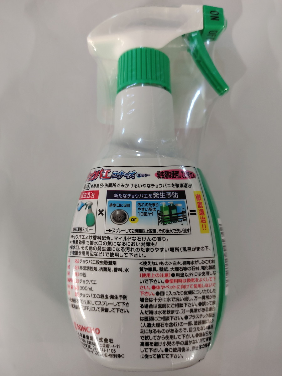 THÀNH PHẦN THÀNH PHẦN: Nước, chất hoạt động bề mặt, chất kháng khuẩn, hương liệu. CÔNG DỤNG CÔNG DỤNG: Sản phẩm chai xịt khử mùi và đuổi ruồi cống Kincho hương xà bông thơm giúp xua đuổi ruồi cống và ấu trùng của ruồi cống khỏi phòng tắm và phòng vệ sinh, đồng thời mang lại hương xà bông thơm tươi mát, giúp loại bỏ mùi hôi, khó chịu ở những khu vực này. CÁCH DÙNG Hướng dẫn sử dụng: Đặt đầu xịt ở chế độ “ON” và xịt sản phẩm trực tiếp vào côn trùng hoặc quanh những khu vực côn trùng hay xuất hiện như bồn tắm, lỗ thoát nước, quanh khu vực để đồ giặt, Để khoảng 2 giờ sau đó rửa sạch bằng nước. Sau khi sử dụng, chuyển đầu xịt về chế độ “OFF” và bảo quản sản phẩm. BẢO QUẢN BẢO QUẢN: Nơi khô ráo, thoáng mát. Tránh tiếp xúc ánh sáng trực tiếp hoặc nhiệt độ cao. Để xa tầm tay trẻ em. LƯU Ý: Không sử dụng sản phẩm cho mục đích khác. Không xịt sản phẩm lên cơ thể người hoặc vật nuôi. Nếu sản phẩm dính vào mắt hoặc da, hãy rửa kỹ với nước. Không sử dụng sản phẩm cho các vật liệu gỗ trắng, đồ nội thất, giấy dán tường, vật liệu đá và các thiết bị điện. NHÀ SẢN XUẤT DAINIHON JOCHUGIKU Co.,Ltd. 1-4-11, Tosabori, Nishi-ku, Osaka 550-0001, Japan.