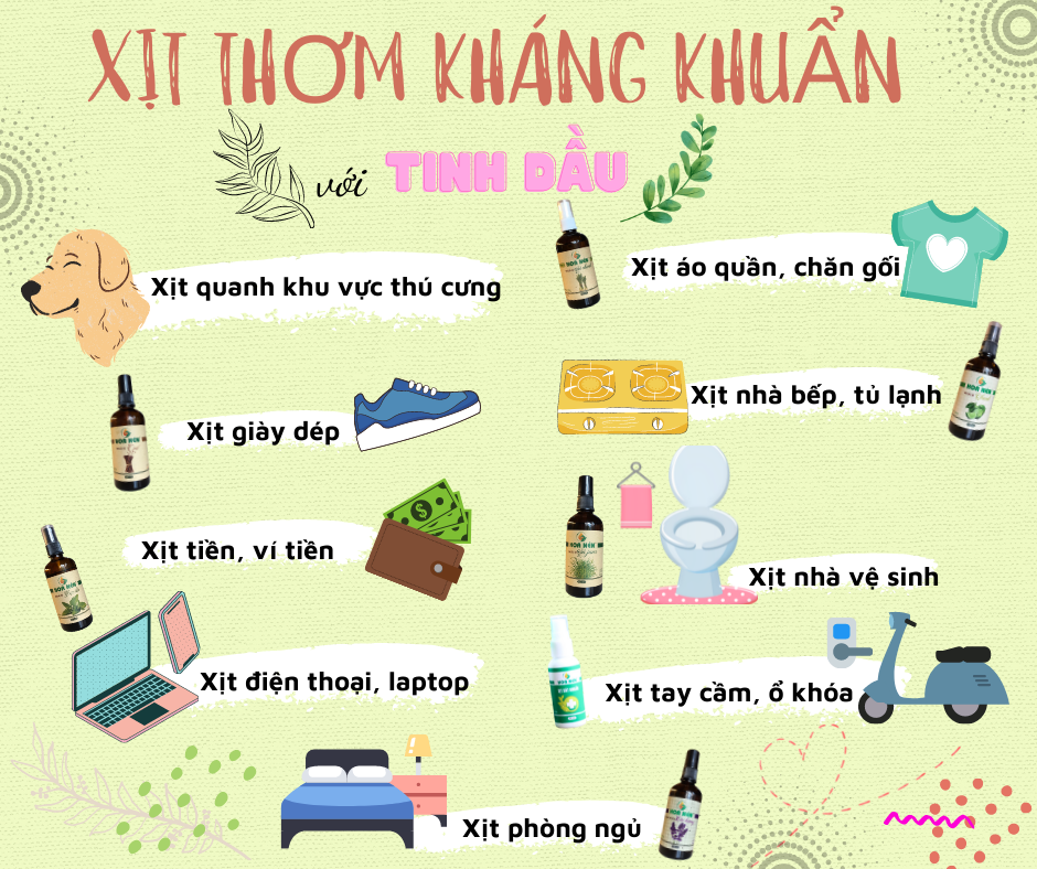 CÔNG DỤNG - Có hoạt tính sinh học ch.ống lại vi sinh vật là ch.ất đề khá của cây nên có tính sát k.huẩn mạnh, xua đuổi muỗi, côn trùng t.ấn công. Vì vậy nó thích hợp sử dụng cho việc xịt mũ bảo hiểm, tủ quần áo, xịt phòng ăn, phòng khách, phòng ngủ, phòng bếp, sàn nhà, nhà vệ sinh và những nơi có nhiều muỗi, côn trùng. - Khác với ốc xịt muỗi phải đóng cửa ra khỏi phòng, loại tinh dầu xịt phòng này có thể xịt thẳng vào da chân tay hoặc ngồi trong trong phòng mà vẫn an toàn sức khỏe. - Đây là tinh dầu được pha loãng không sử dụng chất định hương như những hãng khác nên bay mùi nhanh hơn nhưng lại không ảnh hưởng đến sức khỏe. - Có tác dụng tốt cho hô h.ấp, tăng cườ sứ kh.ỏe, tinh dầu có tính sá ẩn giúp làm sạch không khí, k.hử mùi hôi phòng. - Có hương thơm dễ chịu và quyến rũ đặc trưng, giúp tinh thần thư giãn, phấn chấn, k.ích th.ích khả năng sáng tạo và hăng say làm việc. Ngoài ra còn có tác dụng đuổi muỗi và côn trùng hiệu quả. - Đặc biệt sử dụng để xịt kh.ử mùi hôi giày, hôi chân thay thế cho xịt giày bình thường rất hiệu quả.