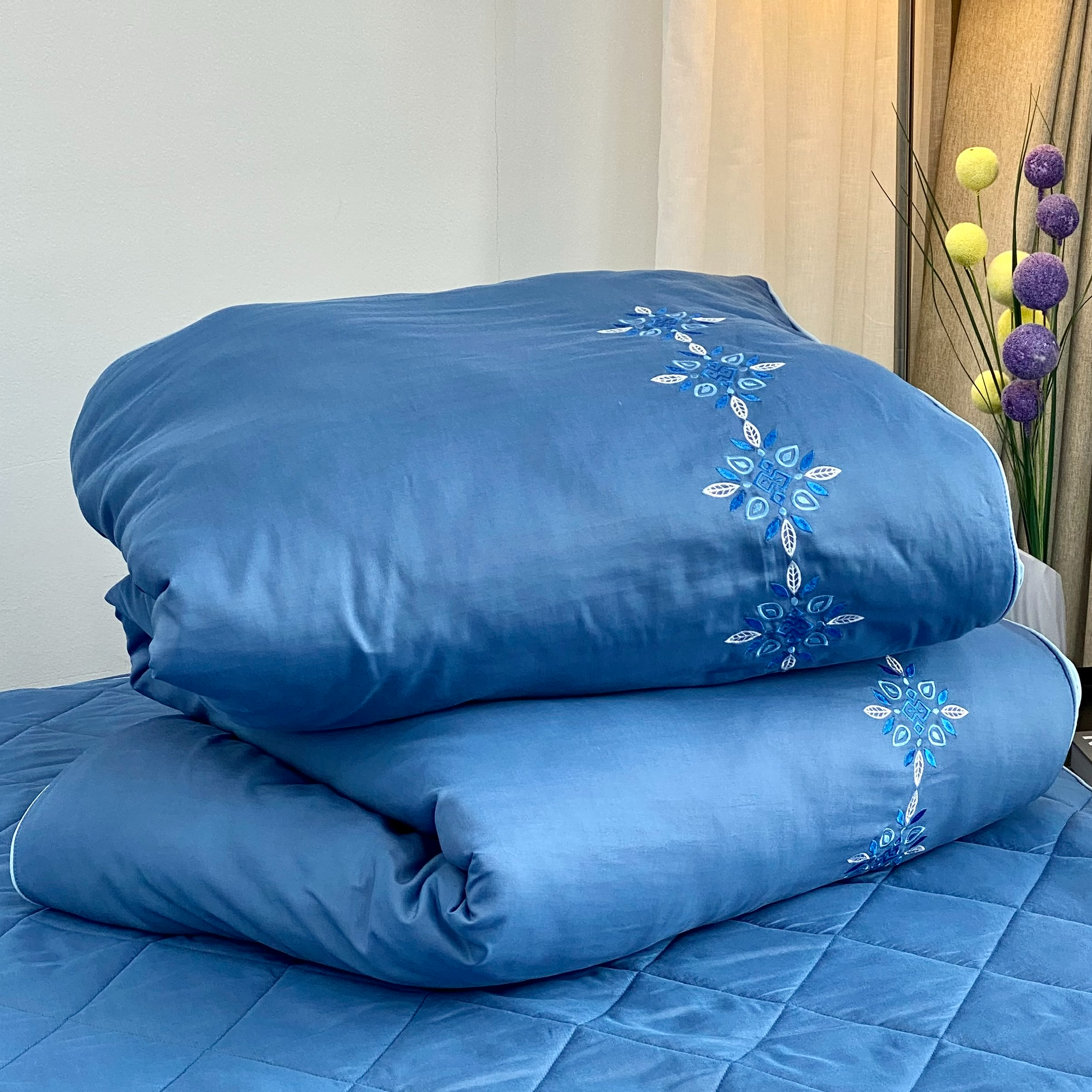 Màu sắc trang nhã , phù hợp với mọi phòng ngủ Chất liệu vải tencel : Vải mềm , mịn , mát , thấm hút mồ hôi tốt chăn bốn mùa kích thước 200*220 rộng