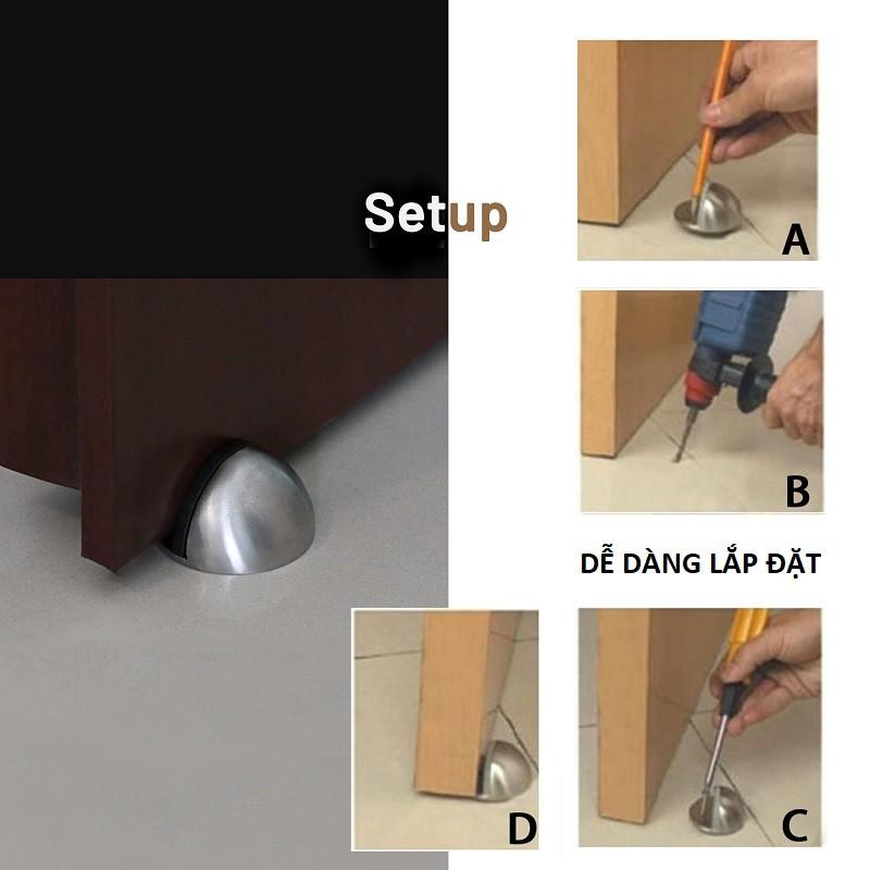 - Chặn cửa bán nguyệt có thể gắn xuống sàn sử dụng miếng dán 3M siêu chắc nhưng chúng tôi khuyến cáo khách hàng lắp đặt trên sàn bê tông hoặc sàn gỗ, đơn giản & linh hoạt bằng bắt vít để bạn khoan vít lắp sàn.