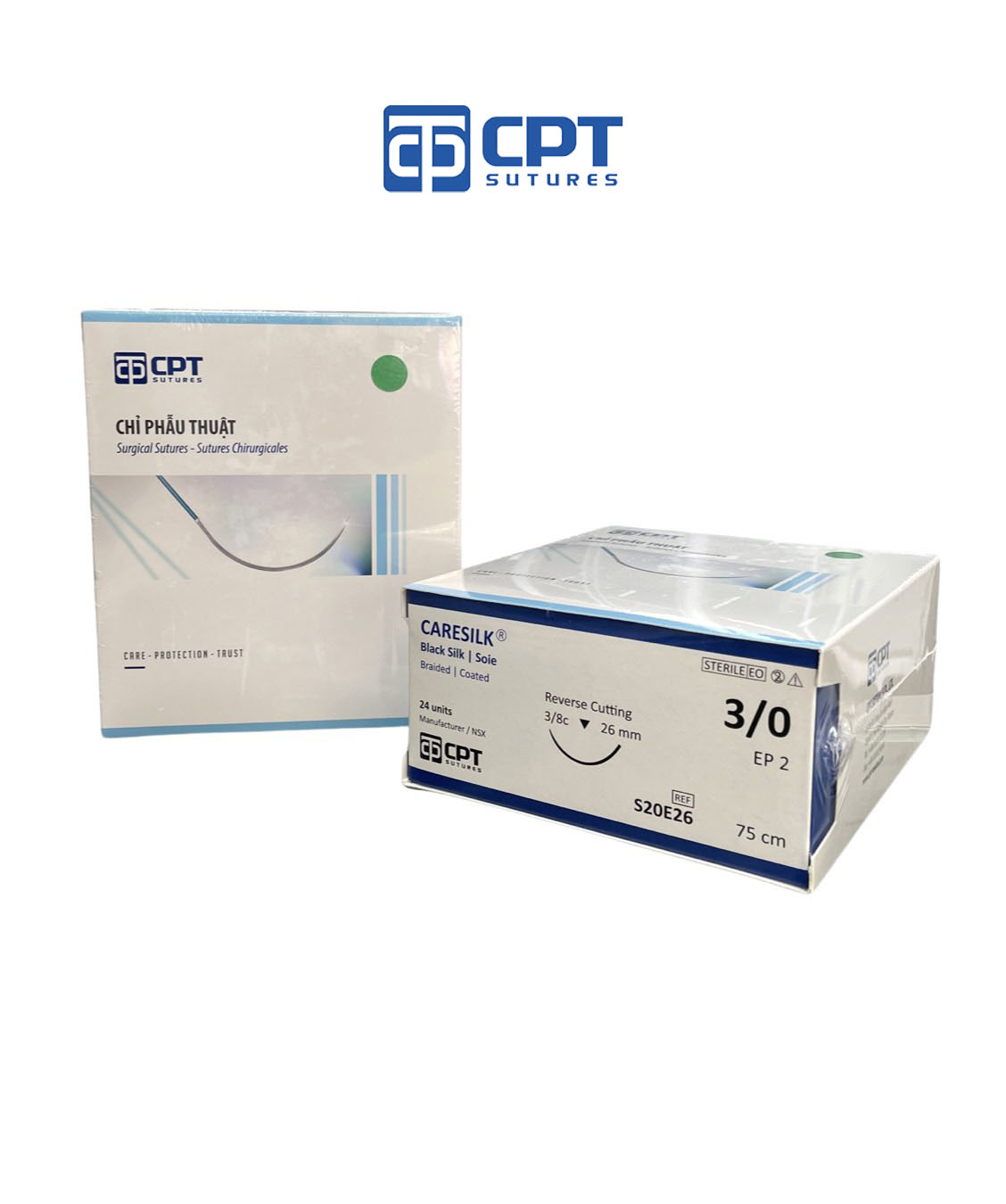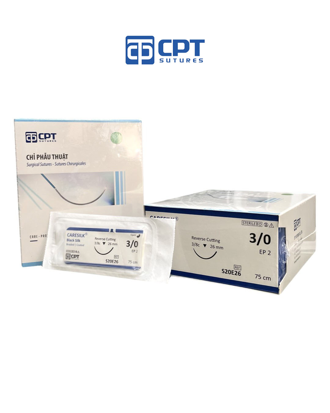 Chỉ phẫu thuật không tiêu Caresilk Silk: size cỡ chỉ: 3/0 USP, dài 75 cm, kim tam giác 3/8c, dài 26 mm, mã hàng: S20E26. Quy cách đóng gói: 24 tép. THÀNH PHẦN: