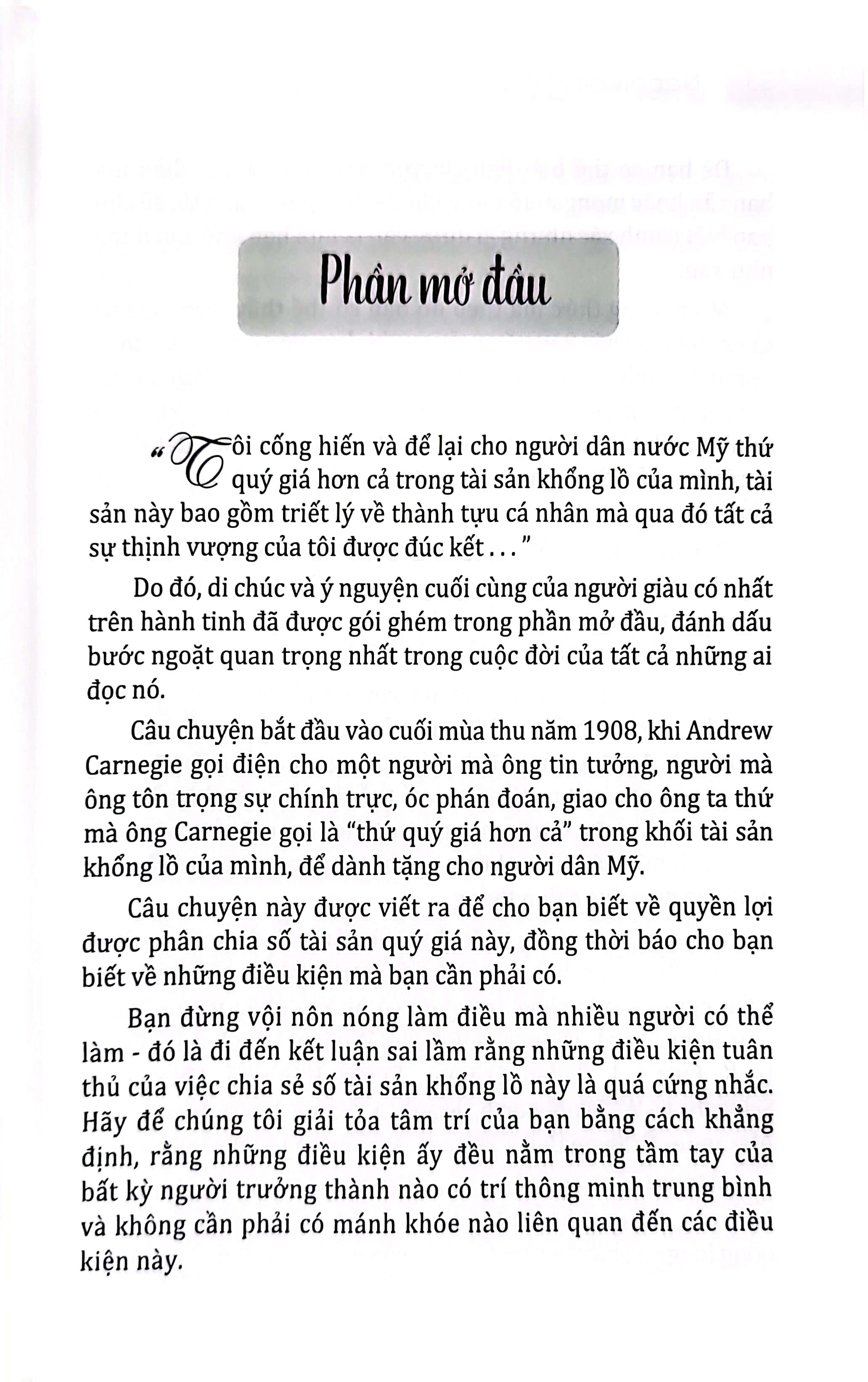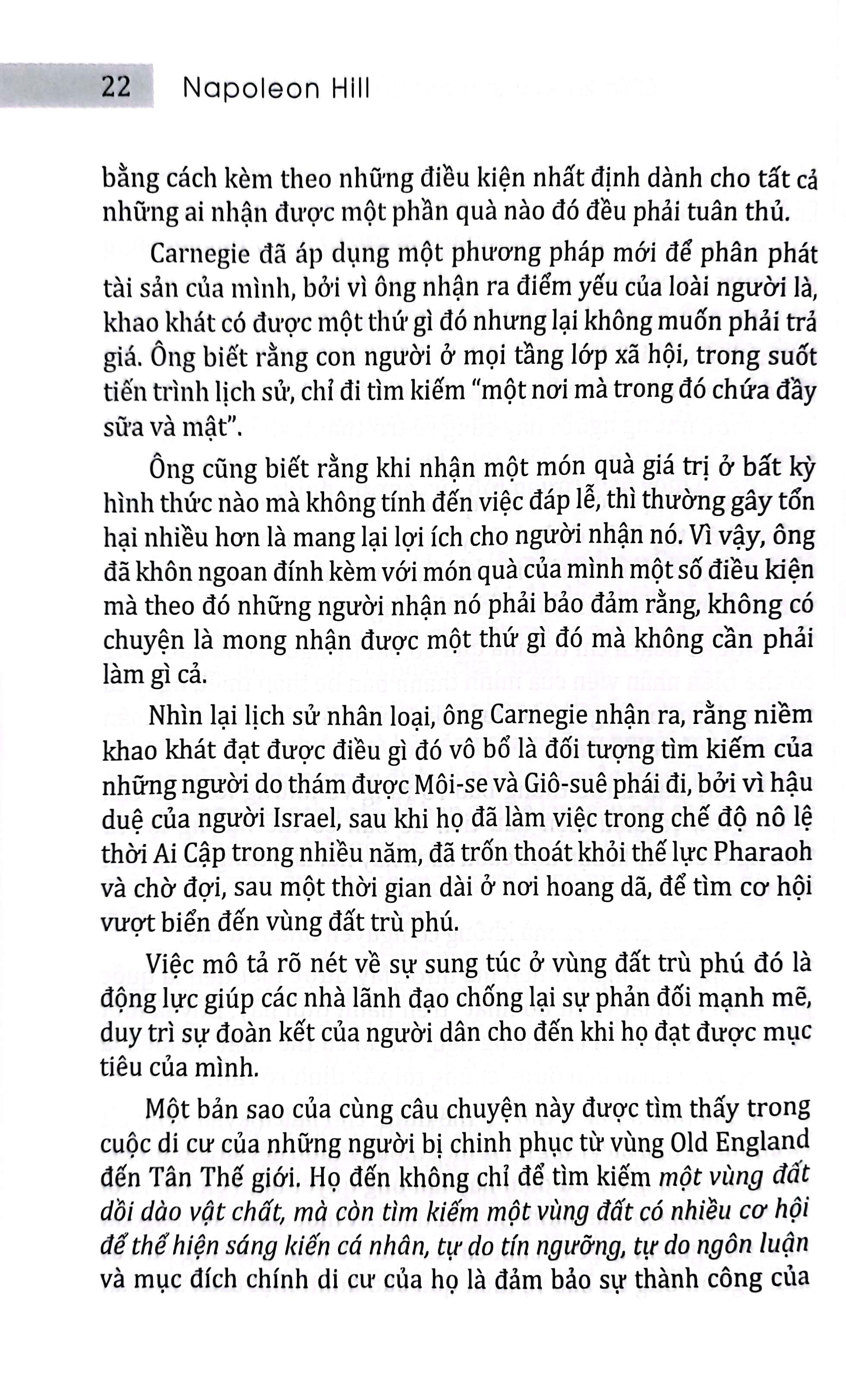 Khi còn là một phóng viên 25 tuổi của tạp chí Thành công, Napoleon Hill đã được cử đi phỏng vấn người giàu nhất ở nước Mỹ: ông trùm ngành thép Andrew Carnegie. Và ngay trong buổi phỏng vấn đó, Carnegie đã đề nghị chia cho Hill phần lớn tài sản của ông. Đó không phải là tiền bạc mà là sự thông thái mà ông tích lũy được về cách bất kì ai cũng có thể trở nên giàu có.