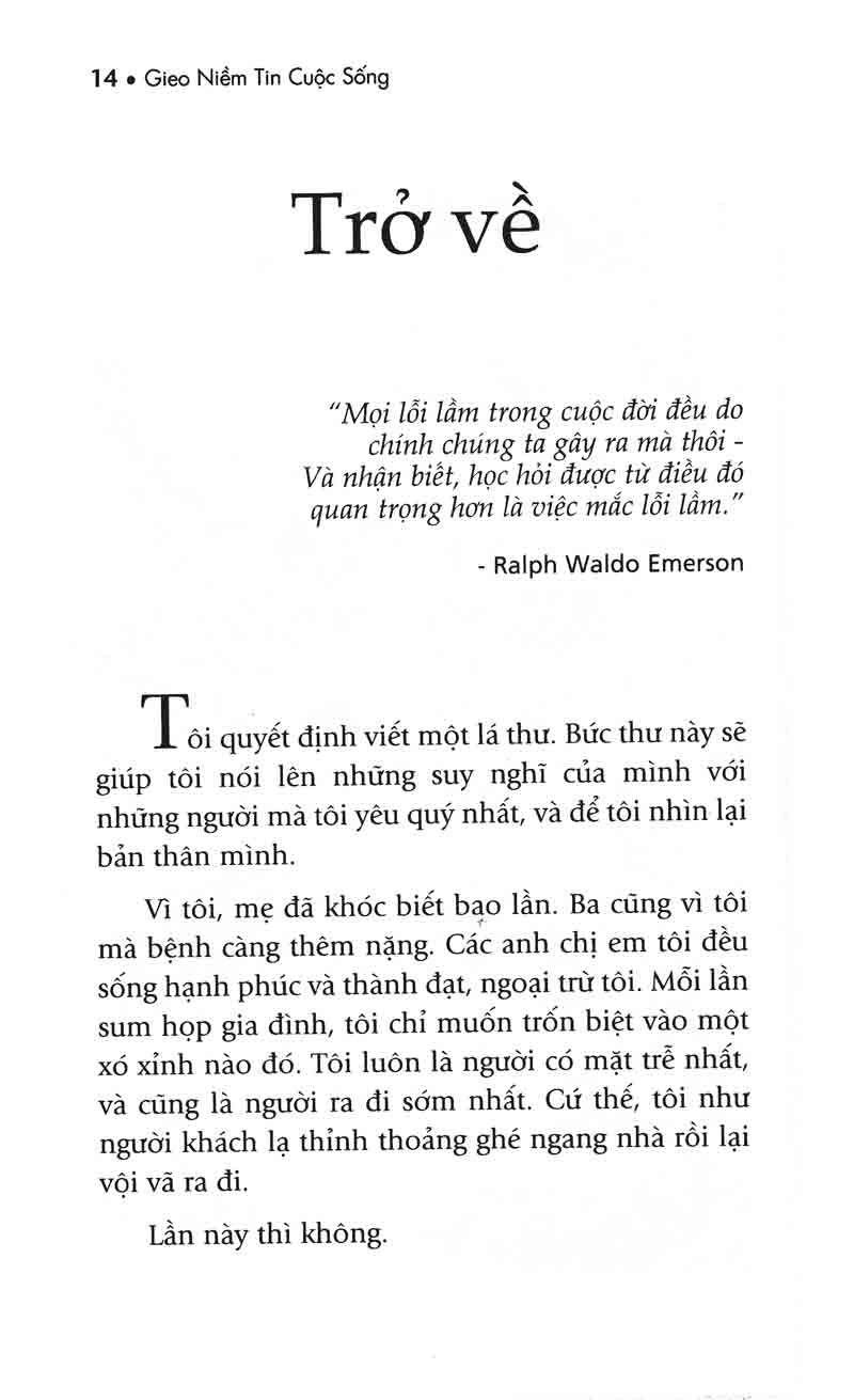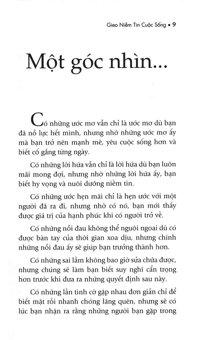 Gieo Niềm Tin Cuộc Sống cũng mong muốn gửi đến bạn đọc một thông điệp như thế. Cuốn sách mà bạn đang cầm trên tay là tập hợp những mẩu chuyện ngắn, súc tích mà cảm động – một vài trong số đó là những câu chuyện có thật. Chỉ là những trang viết ngắn ngủi nhưng thật sự ẩn chứa sức mạnh bằng ngàn lời an ủi, động viên.