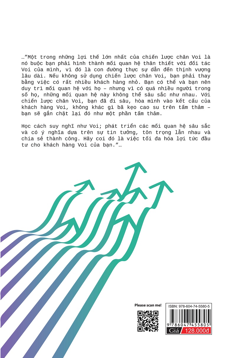 "Một trong những lợi thế lớn nhất của chiến lược chăn Voi là nó buộc bạn phải hình thành mối quan hệ thân thiết với đối tác Voi của mình, vì đó là con đường thực sự dẫn đến thịnh vượng lâu dài. Nếu không sử dụng chiến lược chăn Voi, bạn phải thay bằng việc có rất nhiều khách hàng nhỏ. Bạn có thể và bạn nên duy trì mối quan hệ với họ - nhưng vì có quá nhiều người trong số họ, những mối quan hệ này không thể sâu sắc như nhau. Với chiến lược chăn Voi, bạn đã đi sâu, hòa mình vào kết cấu của khách hàng Voi, không khác gì bã kẹo cao su trên tấm thảm - bạn sẽ gắn chặt lại đó như một phần tấm thảm. Học cách suy nghĩ như Voi; phát triển các mối quan hệ sâu sắc và có ý nghĩa dựa trên sự tin tưởng, tôn trọng lẫn nhau và chia sẻ thành công. Hãy coi đó là việc tối đa hóa lợi tức đầu tư cho khách hàng Vòi của bạn."