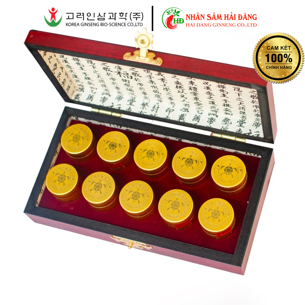Quy Cách: hộp gỗ 10 viênXuất Xứ: Hàn QuốcThành Phần:Chiết xuất: Nhân sâm 112mg, Cam thảo 225mg, Sơn dược 322mg, Da cừu 79mg, Đương quy 71mg, Quả mơ 72mg, Mẫu đơn trắng 72mg, Mạch môn 72mg, Hoàng cầ...