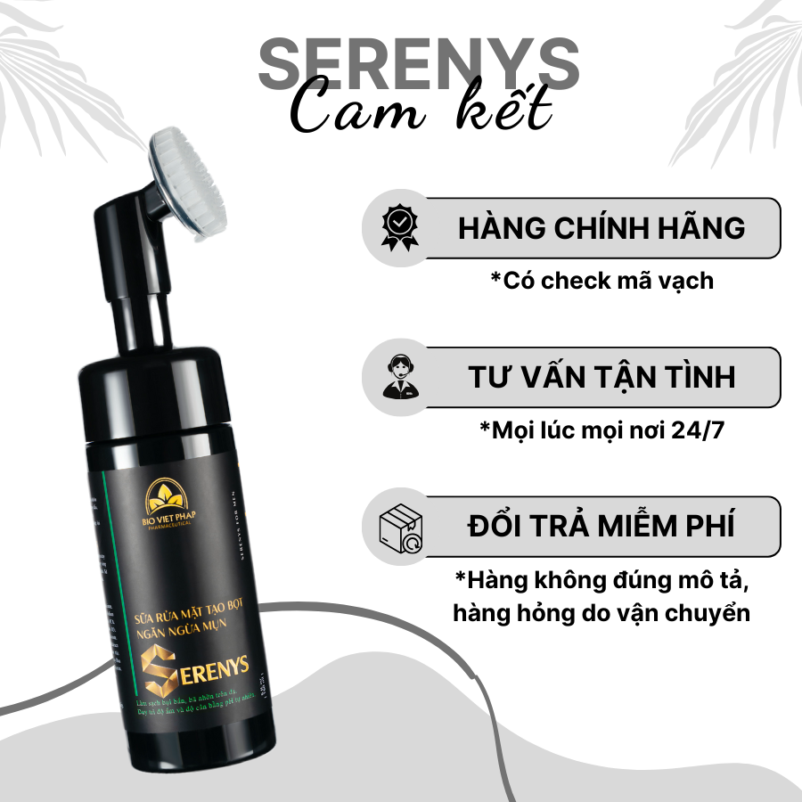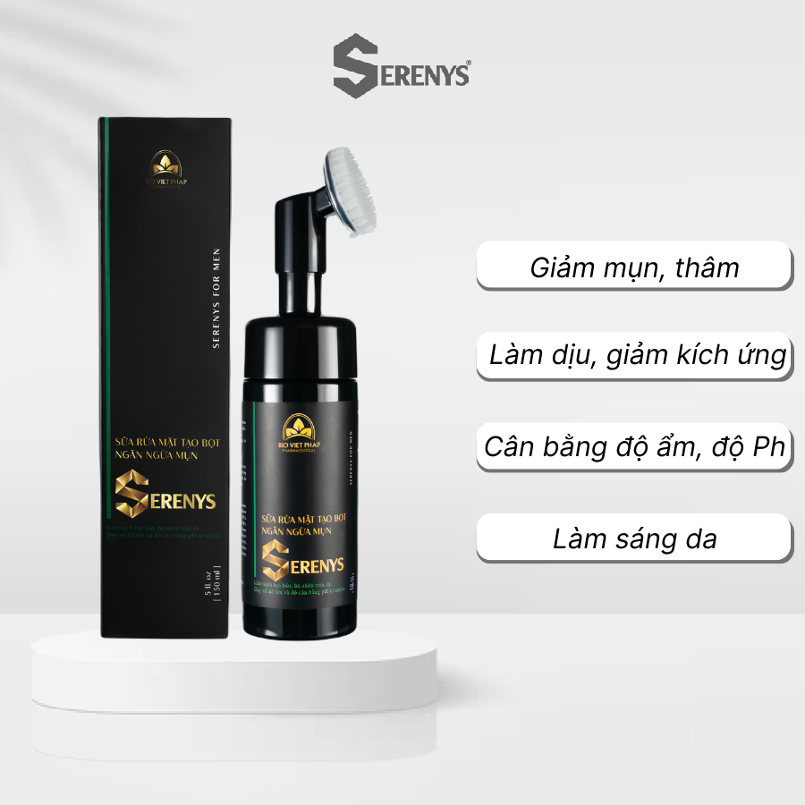 Mua tại TiktokBọt rửa mặt Serenys 150ml Bọt rửa mặt Serenys tạo bọt sẵn làm sạch sâu từng lỗ chân lông là sản phẩm chăm sóc da mụn từ tinh dầu Tràm trà hoàn toàn từ thiên nhiên. Sản phẩm không chứa các hóa chất gây hại cho da như hương liệu, phẩm màu, cồn, dầu khoáng, paraben. Có thể sử dụng hàng ngày để giúp da luôn sạch khỏe, trắng sáng và mịn màng. CÔNG DỤNG SỮA RỬA MẶT NAM SERENYS Sữa rửa mặt tạo bọt ngăn ngừa mụn Serenys là hoàn hảo cho nam giới. Giúp: