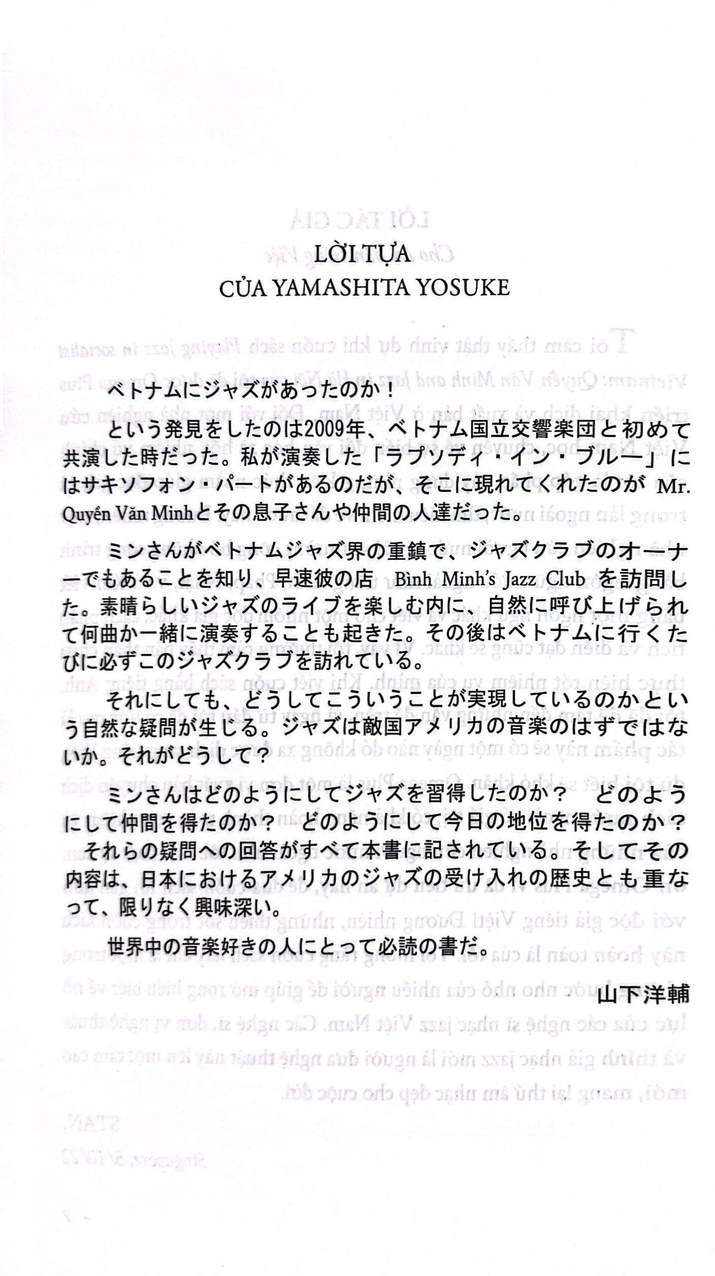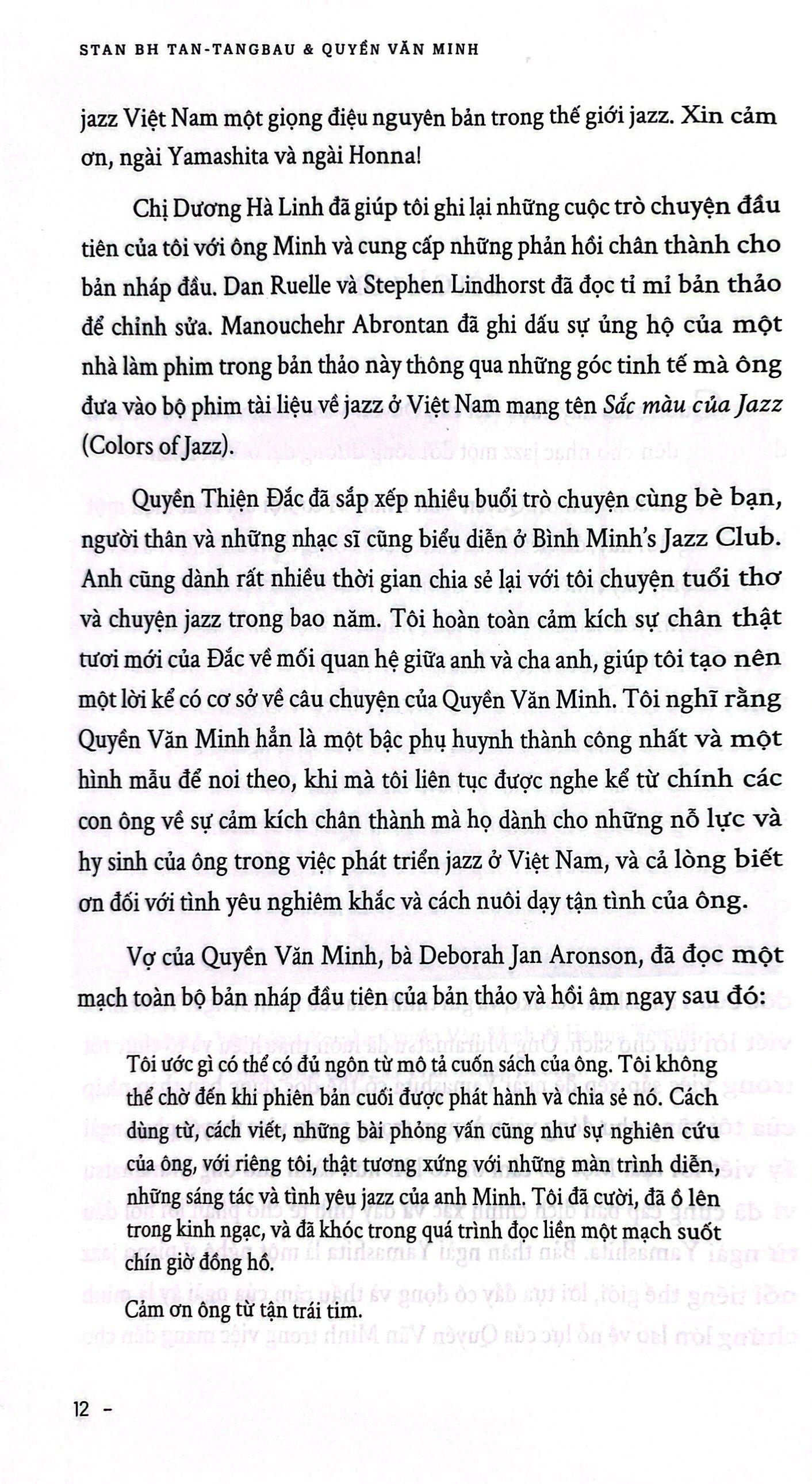 - Dù sinh ra ở Việt Nam, một đất nước cơ bản chẳng biết jazz là gì, tôi đã yêu nhạc jazz từ khi tôi nghe được nó trên radio vào năm 1968. Tôi đã chơi nhạc trong hơn 50 năm kể từ năm 1967, và tôi đã mở quán jazz club hơn 20 năm trước, vào năm 1997. Cái sự thật rằng tôi có đủ niềm tin vào bản thân để chơi jazz, tôi nghĩ, tự thân đã là một thành tựu! Trong những điều kiện hạn chế mà tôi học chơi jazz, tôi đã trở thành một nhạc sĩ chuyên nghiệp, và rồi trở thành một giáo viên saxophone và nhạc jazz. (tr.49)
