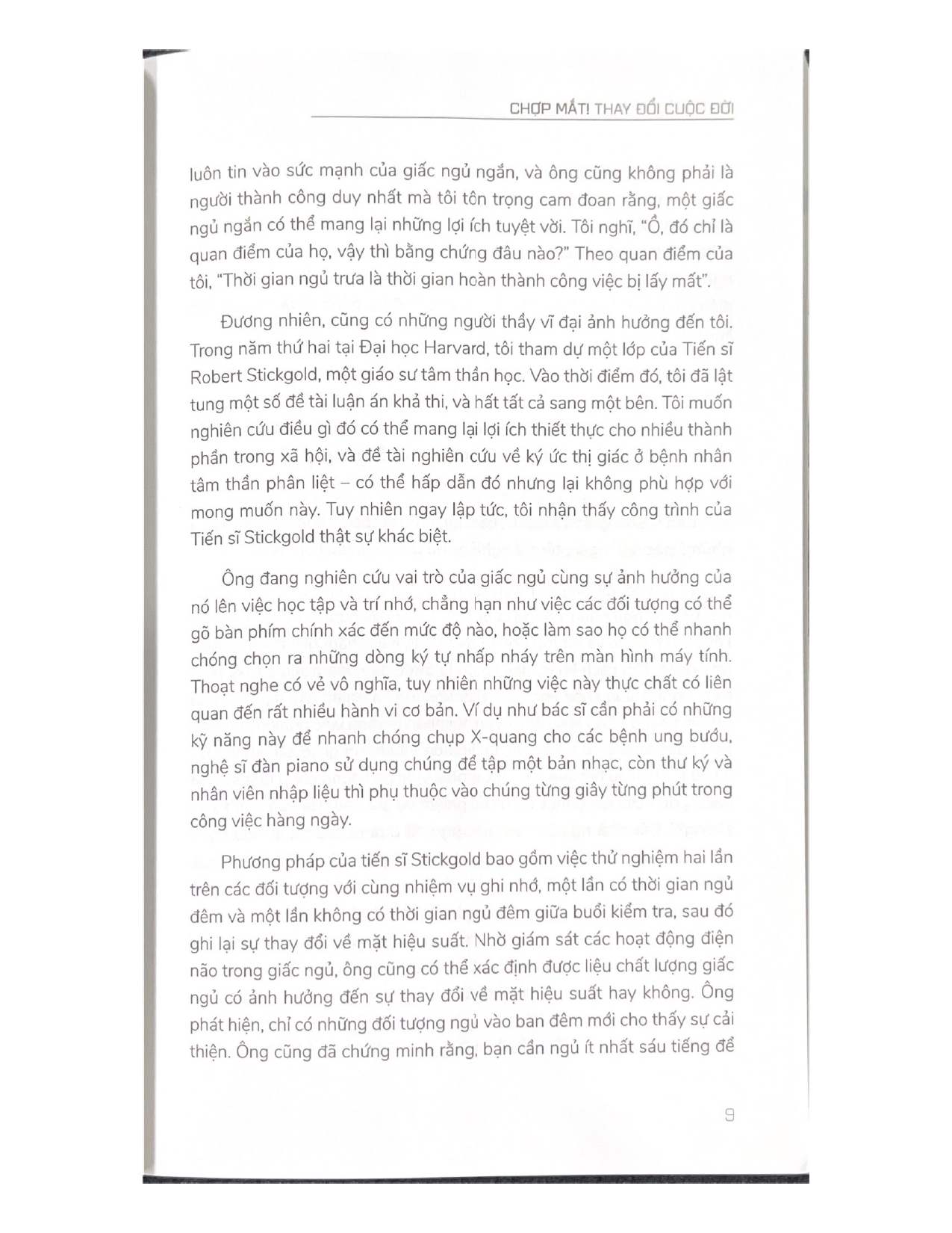 Chợp Mắt! Thay Đổi Cuộc Đời - Take A Nap! Change Your Life-Vanlangbooks I.Giới thiệu sách Quyển sách mang tính đột phá này của tiến sĩ Sara C. Mednick và Mark Ehrman đã cung cấp các bằng chứng thuyết phục, chứng minh một giấc ngủ ngắn vào buổi trưa sẽ mang lại những lợi ích về tâm sinh lý lẫn nhận thức. Nếu bạn muốn luôn tỉnh táo, năng động và có tâm trạng tốt trong cả ngày dài thì hãy chợp mắt một chút”.