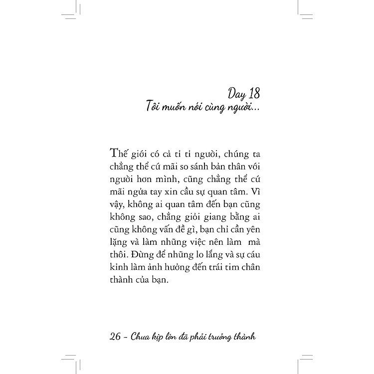 Nếu bạn đang trải qua giai đoạn lạc lõng và cô đơn như vậy, hãy để “Chưa kịp lớn đã phải trưởng thành” làm một người bạn ở bên, xoa dịu tổn thương và gửi tặng bạn đôi điều khích lệ. Mỗi trang sách đều là một lá thư nhắn nhủ bạn về sự đặc biệt của bản thân, về những nỗ lực hoàn thiện không ngừng nghỉ trong thế giới của người trưởng thành.