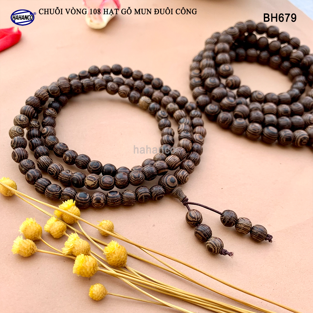Vòng đeo tay chuỗi tràng 108 hạt gỗ mun đuôi công có vân gỗ tự nhiên siêu đẹp và độc đáo, mang lại phong cách mới, bởi vân gỗ hiếm có do thiên nhiên ban tặng. Giúp mang lại may mắn, tài lộc, giảm tai ương cho người đeo chuỗi, có một cuộc sống an viên, vui vẻ và hạnh phúc, giúp cho người đeo cảm thấy tinh thần phấn chấn, ngăn chặn sự bực tức trong tâm (tặng kèm thêm dây để thay thế). Mô tả sản phẩm: