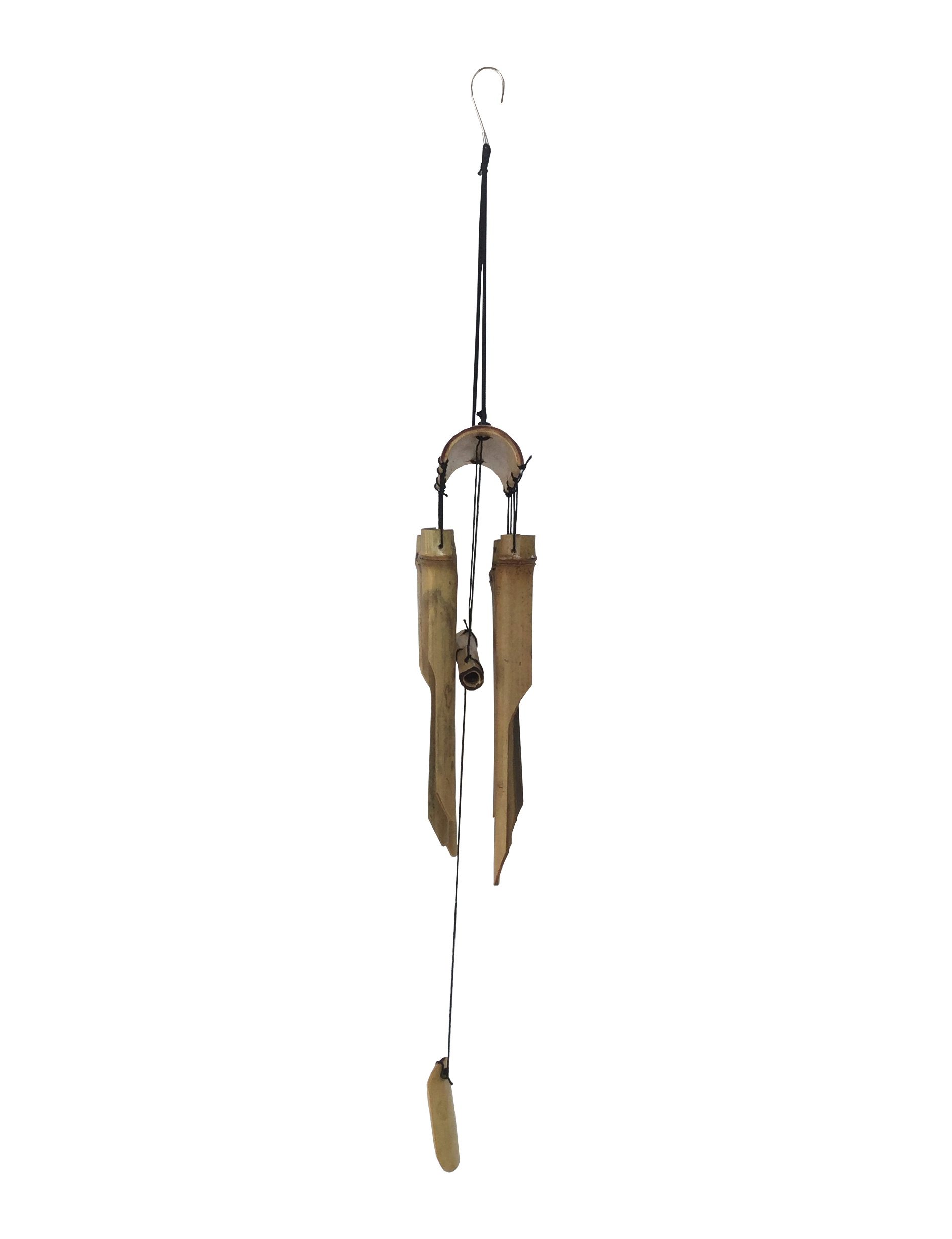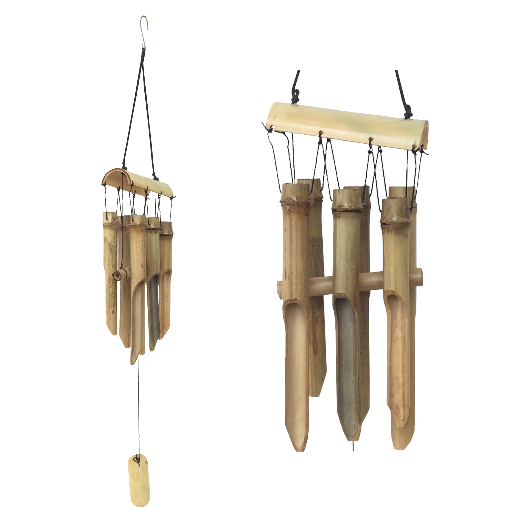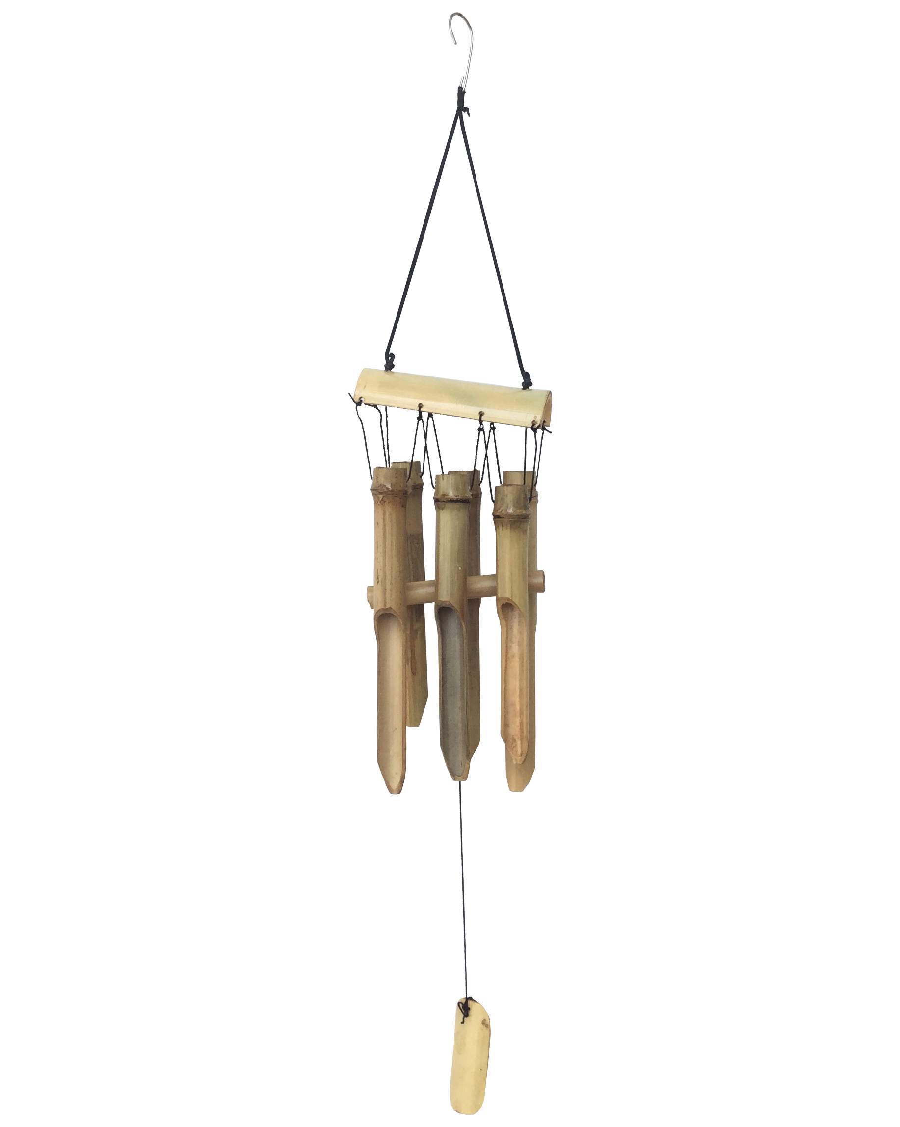 Một bộ chuông gió gồm 6 ống trúc, chóp là thanh trúc ngang - loại nguyên vật liệu rất bền và thân thiện với môi trường.