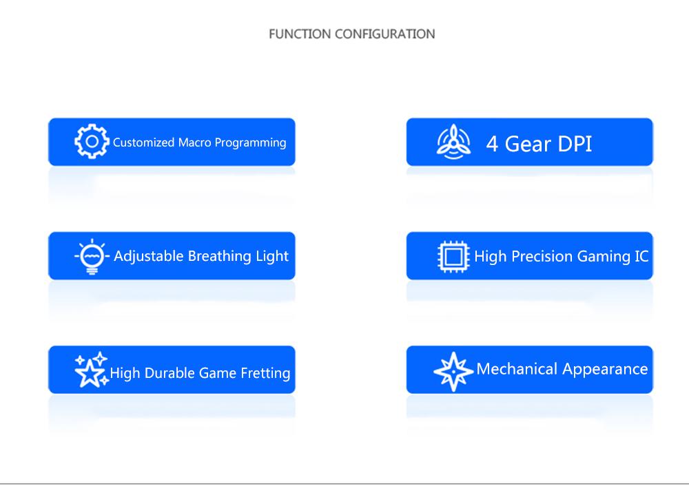 Cost-efficency, beautiful shape, great hand feel, a wonderful product. Features: Colorful breathing backlit, charming at use. Adjustable DPI, four gear, up to 4000, meet your different need. On the left is still 2 function keys,