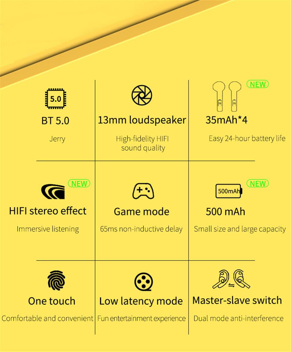 - Bluetooth 5.0, tiêu thụ điện năng thấp Lưu ý: Khi mua tai nghe bluetooth tws quý khách vui lòng đọc hướng dẫn sau: Do vận chuyển lâu ngày nên nguồn điện của tai nghe tws sẽ cạn kiệt, sau khi nhận gói hàng quý khách sẽ không sử dụng được tai nghe, có thể đóng lại. điều đầu tiên cần làm là sạc hộp tai nghe trong 30 phút. Rất quan trọng. Cảm ơn! Bảng kê hàng hóa: 1 Tai nghe Bluetooth (l) 1 Tai nghe Bluetooth (r) 1 hộp sạc 1 Cáp dữ liệu 1 * Hướng dẫn sử dụng