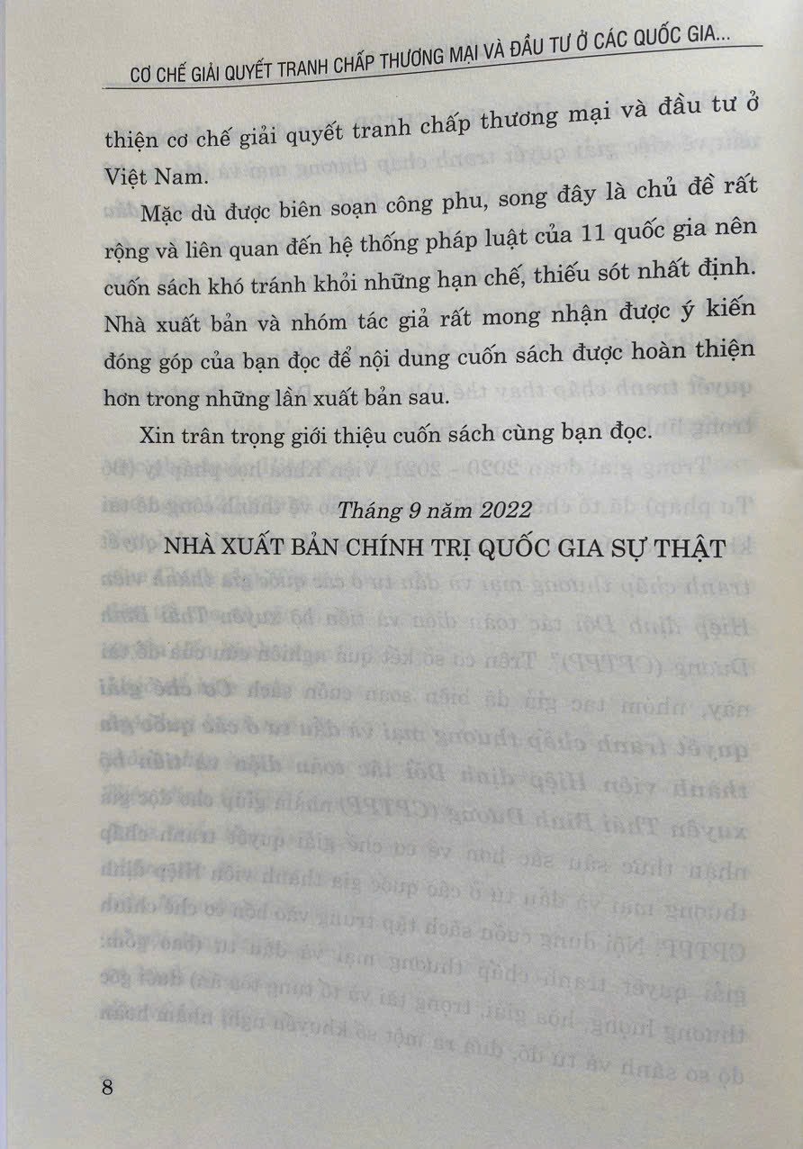 Cơ chế giải quyết tranh chấp thương mại và đầu tư Tác giả: Ts. Nguyễn Văn Cương (Chủ Biên) Nhà xuất bản: Chính trị Quốc gia Sự thật Công ty phát hành: Nhà xuất bản Chính trị Quốc gia Sự thật Năm xuất bản: 12/2022 Số trang: 478 Khổ sách: 16*24cm Nội dung: "Trong giai đoạn 2020-2021, Viên Khoa học pháp lý (Bộ Tư pháp) đã tổ chức nghiên cứu và bảo vệ thành công đề tài khoa học cấp Bộ "Nghiên cứu so sánh cơ chế giải quyết tranh chấp thương mại và đầu tư ở các quốc gia thành viên Hiệp định đối tác toàn diện và tiến bộ xuyên Thái Bình Dương". Trên cơ sở kết quả nghiên cứu của đề tài này, nhóm tác gải đã biên soạn cuốn sách "Cơ Chế Giải Quyết Tranh Chấp Thương Mại Và Đầu Tư Ở Các Quốc Gia Thành Viên Hiệp Định Đối Tác Toàn Diện Và Tiến Bộ Xuyên Thái Bình Dương (CPTPP)" nhằm giúp cho độc giả nhận thức sâu sắc hơn về cơ chế giải quyết tranh chấp thuưương mại và đầu tư ở các quốc gia thành viên Hiệp định CPTPP. Nội dung cuốn sách tập trung vào 4 cơ chế chính giải quyết tranh chấp thương mại và đầu tư gồm: thương lượng, hòa giải, trọng tài và tố tụng tòa án dưới góc độ so sánh và từ đó, đưa ra một số khuyến nghị nhằm hoàn thiện cơ chế giải quyết tranh chấp thương mai và đầu tư ở Việt Nam.