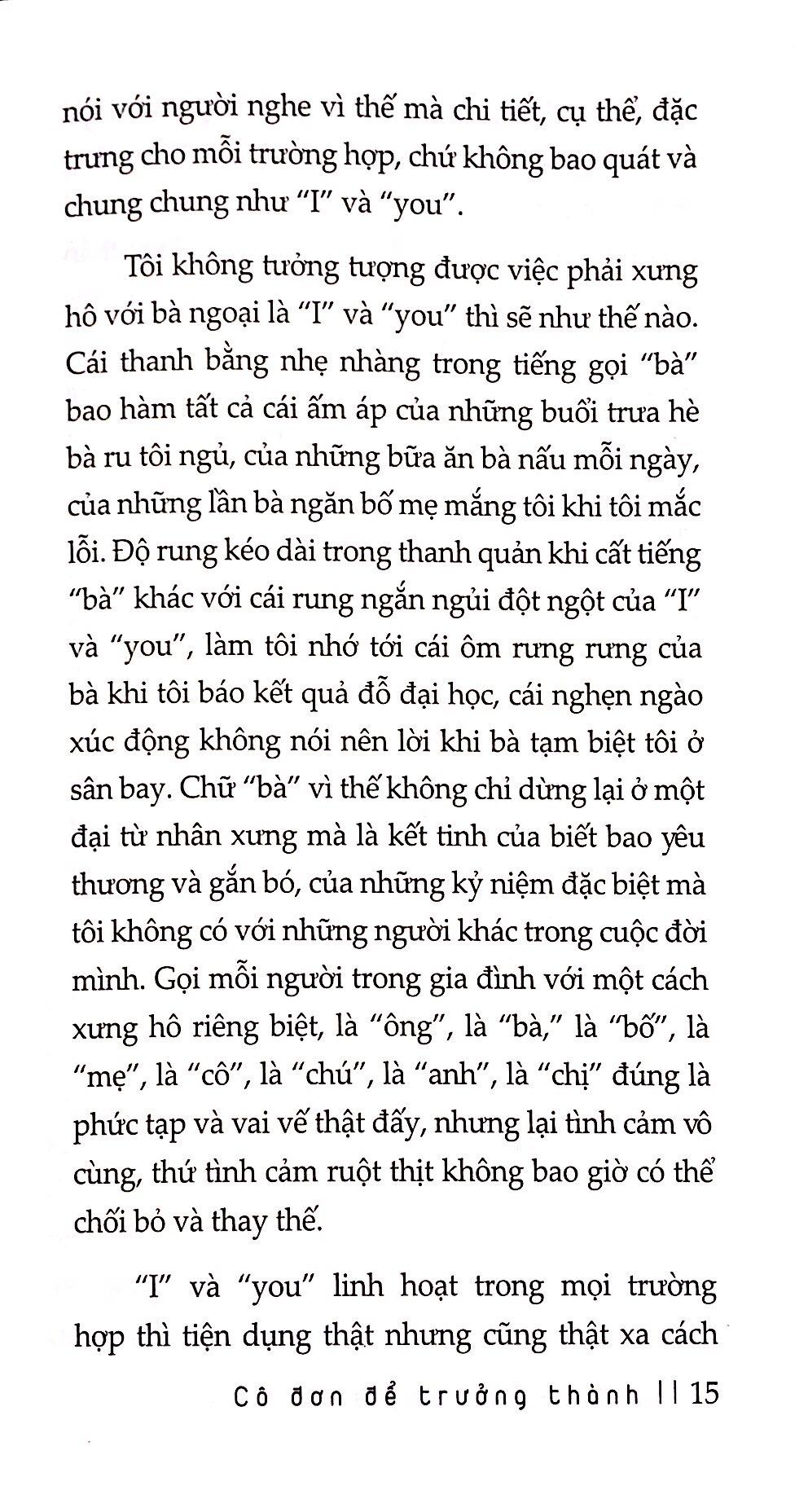 Cô Đơn Để Trưởng Thành Bốn năm du học Mỹ của tôi đọng lại trong những trang văn này, những ghi chép về sự va chạm văn hóa ngay từ tuần đầu tiên, về sự khác biệt giữa các mối quan hệ ở Việt Nam và Mỹ, về cách nói chuyện của sinh viên bản xứ, cách họ ăn uống, tiệc tùng, về những gì tôi được dạy ở trường và cả những điều tôi phải tự học bằng trải nghiệm. Dù phải đối mặt với rất nhiều khó khăn khi sống một mình ở một đất nước xa lạ, tôi vẫn biết ơn vô cùng bốn năm vừa qua. Quãng thời gian ấy có đủ cung bậc của tiếng cười và cũng đủ sắc thái của sự cô đơn. Chính trong sự cô đơn ấy mà tôi thật sự trưởng thành.