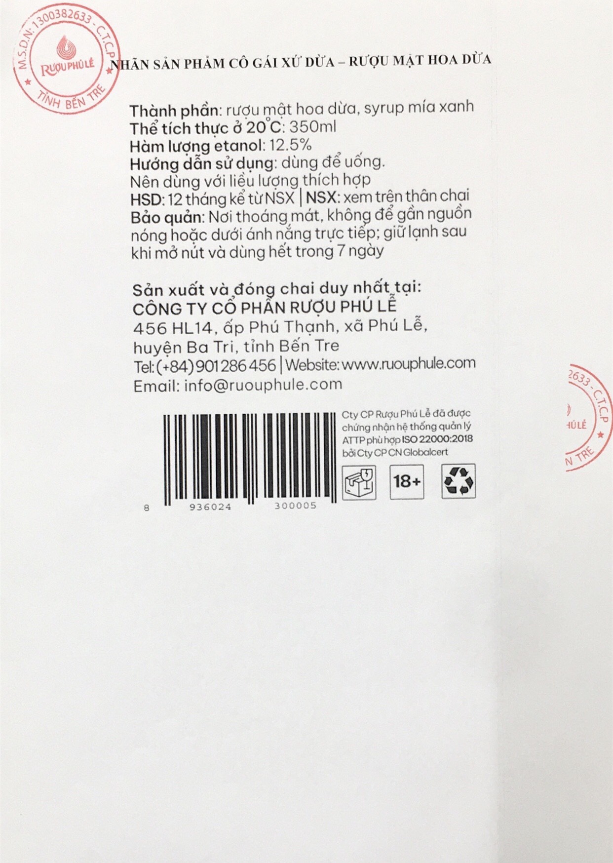 Mua tại TiktokCô Gái Xứ Dừa với thành phần từ mật hoa dừa lên men, mang đến cảm giác chua thanh, dịu ngọt. Sản phẩm phù hợp để uống khai vị và nhâm nhi trong lúc chuyện trò, Thành phần: rượu mật hoa dừa, syrup mía xanh Thể tích thực ở 20 độ C: 350ml Hàm lượng etanol: 12.5% Hướng dẫn sử dụng: dùng để uống, nên dùng với liều lượng thích hợp HSD: 12 tháng Bảo quản: nơi thoáng mát, không để gần nguồn nóng hoặc dưới ánh nắng trực tiếp; giữ lạnh sau khi mở nút và dùng hết trong 7 ngày Sản xuất và đóng chai duy nhất tại: CÔNG TY CỔ PHẦN RƯỢU PHÚ LỄ