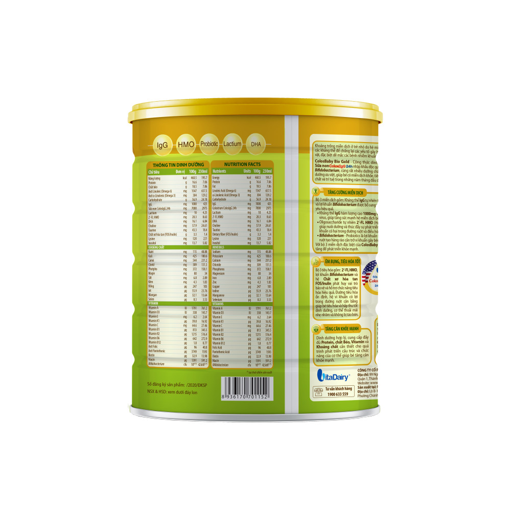 COLOSBABY BIO GOLD 1+ 800g Khoảng trống miễn dịch ở trẻ nhỏ do hệ miễn dịch non yếu chưa hoàn thiện, thiếu các kháng thể để chống lại các yếu tố gây bệnh từ vi khuẩn, virus khiến trẻ hay ốm vặt, đặc biệt dễ mắc các bệnh nhiễm khuẩn tiêu hóa, hô hấp. ColosBaby Bio Gold - Công thức dinh dưỡng đột phá của VitaDairy, với Sữa non ColosIgG 24h nhập khẩu độc quyền từ Mỹ, kết hợp 2’-FL HMO, lợi khuẩn Bifidobacterium, cùng rất nhiều dưỡng chất cao cấp đem đến cho bé nguồn dinh dưỡng ưu việt, giúp bé có miễn dịch khỏe, tiêu hóa tốt và phát triển vượt trội cả về thể chất và trí tuệ trong những năm tháng đầu đời. Thanh nhẹ vị tự nhiên
