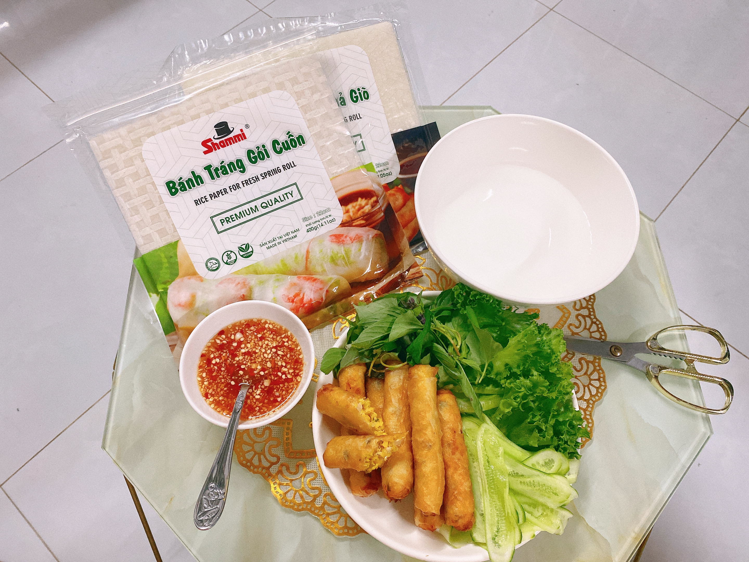 - KHÔNG gluten Sản phẩm đạt chứng chỉ HALAL, FSSC22000 có thể sử dụng được cả chay và mặn. Khối lượng: 200g Hạn sử dụng: 2 năm HƯỚNG DẪN SỬ DỤNG: 1/ Nhúng bánh tráng vào nước trong 4s, sau đó đặt bánh ra dĩa dẹp. 2/ Đặt rau, thịt, tôm hay topping bạn muốn vào giữa bánh, ở vị trí ⅓ từ dưới lên. 3/ Gấp bánh từ phía dưới lên. 4/ Gấp bánh từ phía 2 bên vào. 5/ Cuộn tròn bánh lại rồi thưởng thức với nước chấm tùy thích. THÀNH PHẦN DINH DƯỠNG (TRÊN 100G):