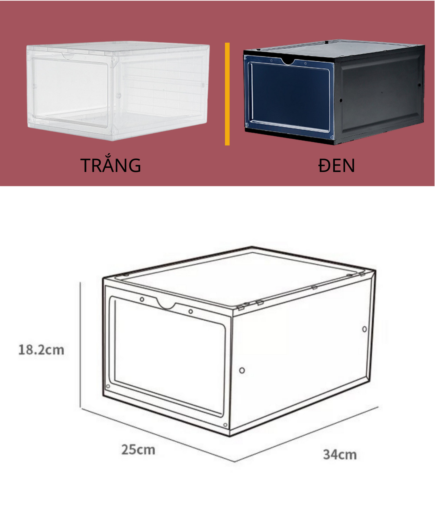 - Kích thước dài 35,5 rộng 26 cao 18cm Hộp chất liệu là nhựa cứng cao cấp nên rất bền và chắc chắn. Hộp giày size lớn cao 18cm có thể đựng được các loại giày cổ cao, giày cao gót với chiều cao tương đương. Hộp giày trong suốt có nắp đóng mở nên bạn dễ dàng thấy được những đôi giày trong hộp và giúp bạn dễ dàng khi lấy ra dùng. Chứa được tất cả loại giày: giày sneaker, giày cao gót, giày tây…