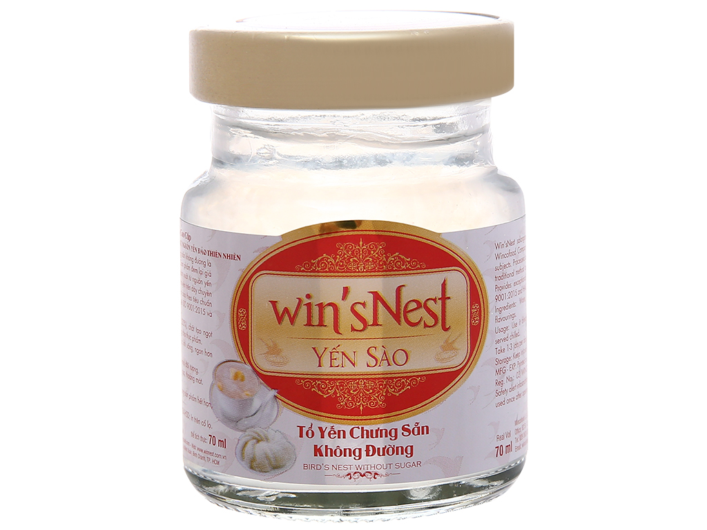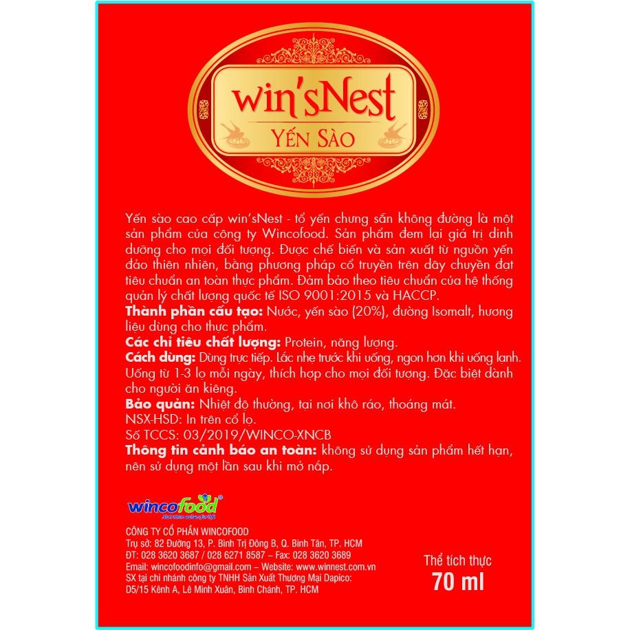 Yến Sào cao cấp win'snest Tổ Yến Chưng Sẵn Không Đường 20% được sản xuất từ nguồn yến đảo thiên nhiên, là một sản phẩm của công ty wincofood. Được sản xuất bằng phương pháp cổ truyền trên dây chuyền đạt tiểu chuẩn an toàn thực phẩm.