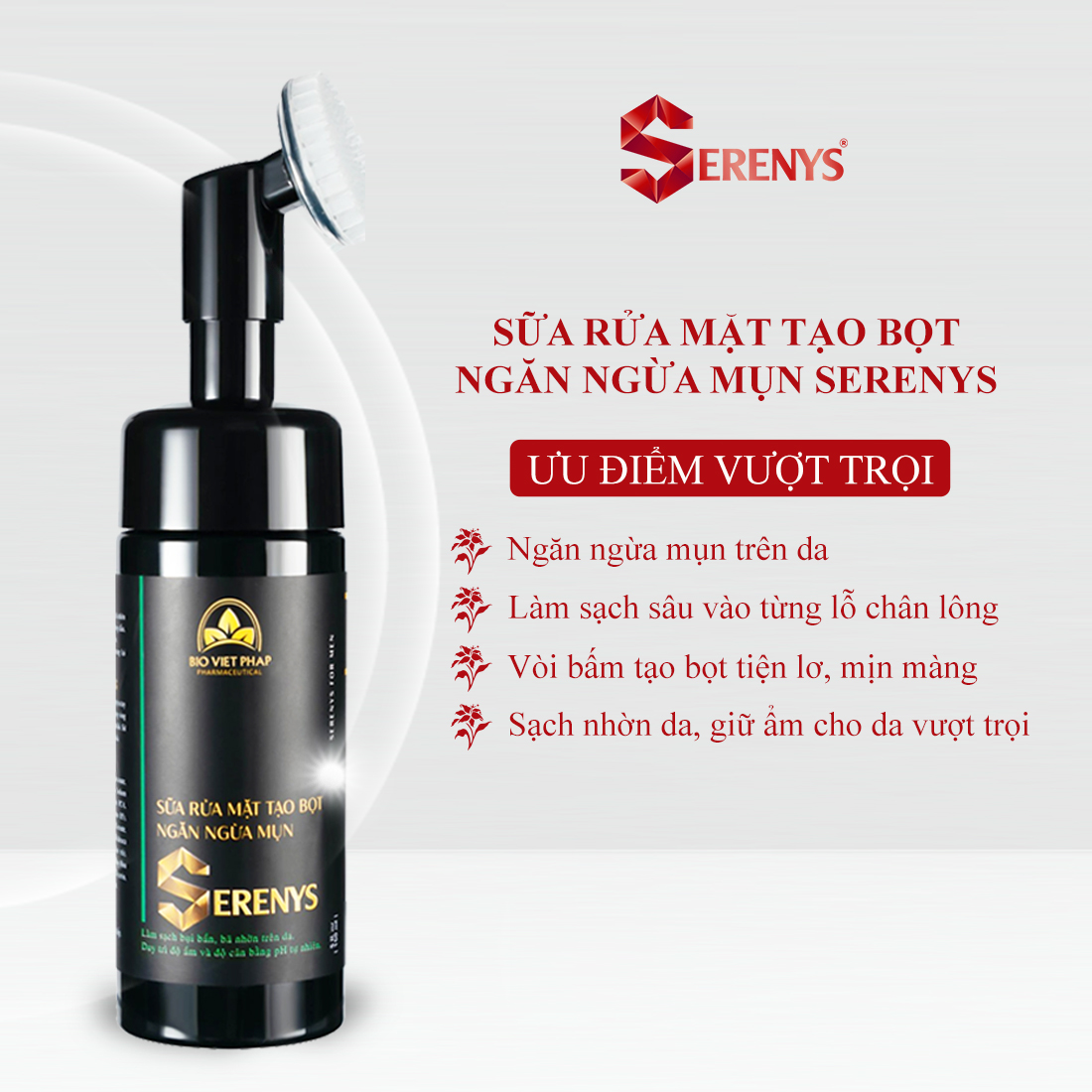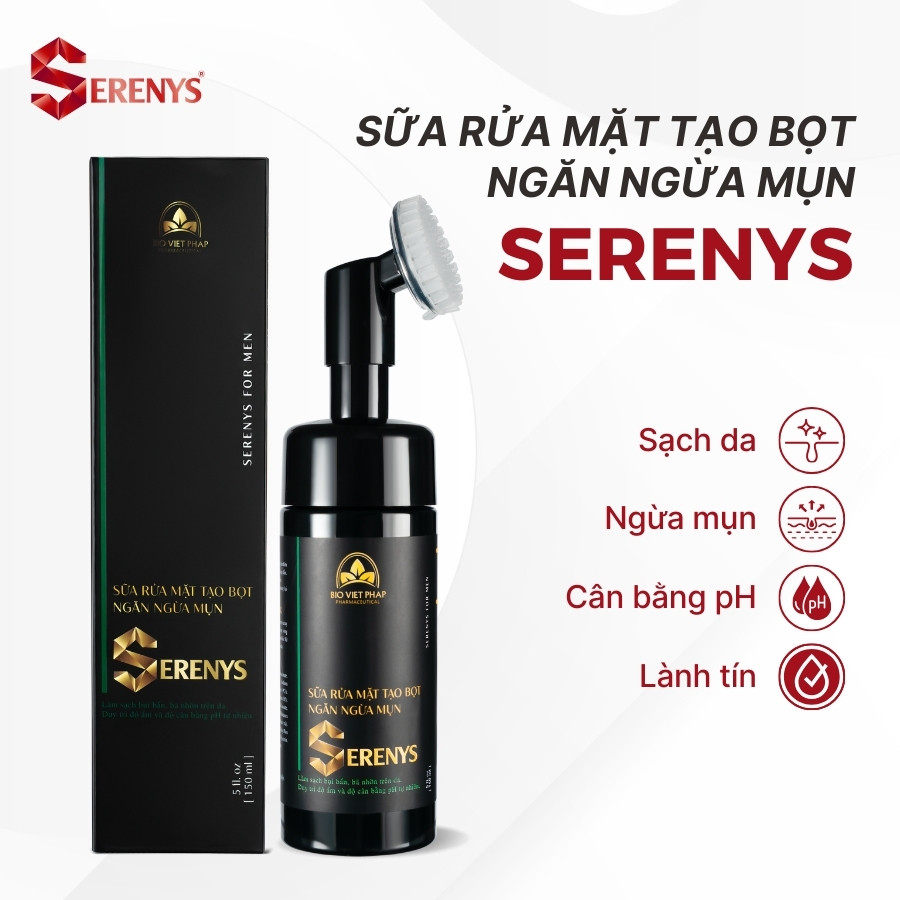 Mua tại TiktokBọt rửa mặt Serenys 150ml Bọt rửa mặt Serenys tạo bọt sẵn làm sạch sâu từng lỗ chân lông là sản phẩm chăm sóc da mụn từ tinh dầu Tràm trà hoàn toàn từ thiên nhiên. Sản phẩm không chứa các hóa chất gây hại cho da như hương liệu, phẩm màu, cồn, dầu khoáng, paraben. Có thể sử dụng hàng ngày để giúp da luôn sạch khỏe, trắng sáng và mịn màng. CÔNG DỤNG SỮA RỬA MẶT NAM SERENYS Sữa rửa mặt tạo bọt ngăn ngừa mụn Serenys là hoàn hảo cho nam giới. Giúp: