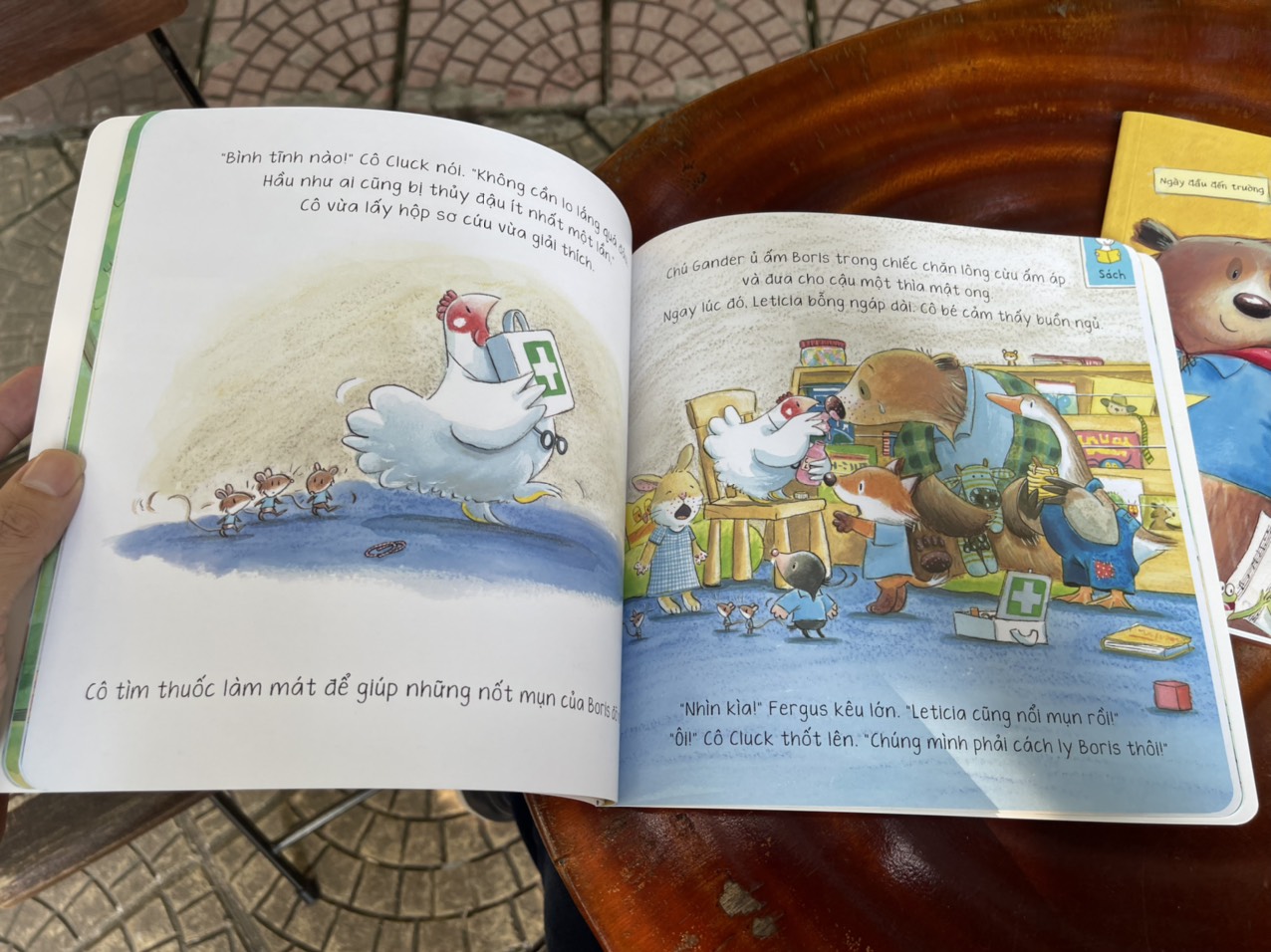 [Combo 2 cuốn NGÀY ĐẦU ĐẾN TRƯỜNG] BORIS GIẢI CỨU BUỔI BIỂU DIÊN Cả lớp đã sẵn sàng cho buổi biểu diễn cuối học kỳ. Nhưng trên đường tới buổi diễn, những vị khách đặc biệt là các bạn ếch và vịt đã bị kẹt trong bùn! Thế là Boris lập tức trở thành một siêu anh hùng nhanh nhất, khỏe nhất, dũng cảm nhất…để giải cứu các bạn, giải cứu buổi diễn. Ai cũng cần một SIÊU ANH HÙNG như Boris trong đời! BORIS BỊ THỦY ĐẬU Vào ngày mà chú Gander từ nông trại tới thăm lớp cô Cluck, một thảm họa đã xảy ra! Đầu tiên là Boris, rồi tất cả các bạn nhỏ đều bị mọc những nốt mụn đỏ bóng, ngứa rát. Sau khi cho các bạn về nhà nghỉ ngơi, cô Cluck cảm thấy cô đơn… nhưng rồi cô bận rộn nướng bánh cho tới khi tất cả khỏi bệnh, quay trở lại lớp để thưởng thức bánh quy thơm lừng, món quà đặc biệt của cô Cluck! Carrie Weston, Tim Warnes Dịch giả: Bảo Bình Nhã Nam phát hành