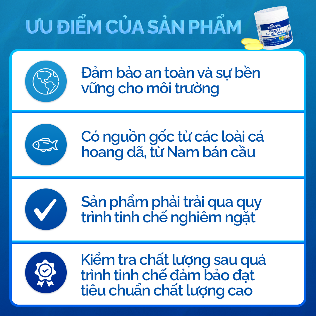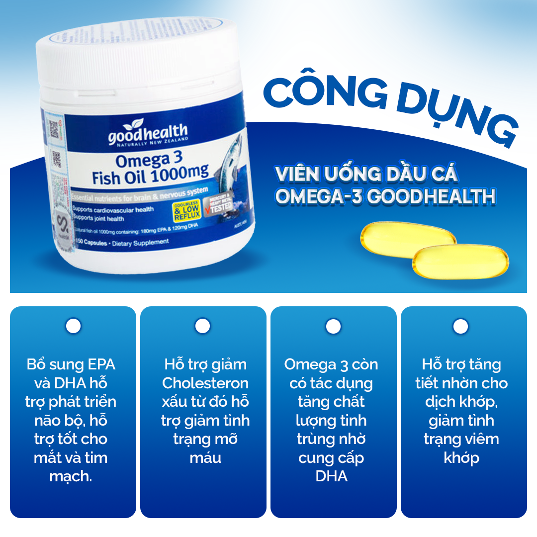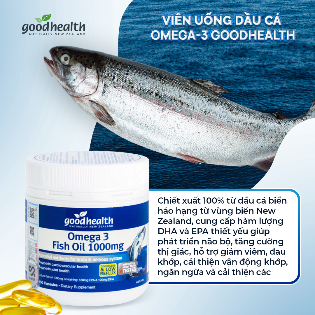 Mua tại TiktokGIỚI THIỆU SẢN PHẨM VIÊN DẦU CÁ GOODHEALTH OMEGA 3 Dầu cá Goodhealth Omega 3 hộp 150 viên nang. Goodhealth Omega 3 Fish Oil 1000mg hay còn gọi là dầu cá Goodhealth Omega 3. Sản phẩm được chiết xuất 100% từ dầu cá biển chất lượng hảo hạng từ vùng biển New Zealand. Đây là vùng biển lạnh, sâu và sạch nhất thế giới. Viên dầu cá Goodhealth Omega 3 cung cấp hàm lượng DHA và EPA thiết yếu giúp phát triển não bộ, tăng cường thị giác, hỗ trợ giảm viêm, đau khớp, cải thiện vận động khớp, ngăn ngừa và cải thiện các bệnh lý tim mạch. THÀNH PHẦN CỦA VIÊN DẦU CÁ GOODHEALTH OMEGA 3 Thành phần trong 1 viên nang Goodhealth Omega 3 có chứa: Thành phần Hàm lượng Dầu cá biển (1000mg) EPA 180mg DHA 120mg ƯU ĐIỂM NỔI BẬT CỦA VIÊN DẦU CÁ GOODHEALTH OMEGA 3 Nguồn nguyên liệu hảo hạng Viên dầu cá Goodhealth Fish Oil 1000mg được sản xuất tại New Zealand, không đơn thuần là dầu cá nuôi như các sản phẩm đại trà, sản phẩm này được chiết xuất từ nguồn nguyên liệu hảo hạng – những loài cá từ vùng biển lạnh, sâu dưới đại dương. Đây là những loại cá nhỏ, có mức độ độc tố thấp và rất giàu Omega 3. Quy trình sản xuất hiện đại Ở New Zealand, Bộ Nông nghiệp và Lâm nghiệp đã đưa ra các tiêu chuẩn nghiêm ngặt nhằm quản lý ngành công nghiệp chế biến dầu cá Omega 3. Quá trình chưng cất dầu cá hiện đại của Goodhealth giúp các tạp chất: Hg, PCBs hay dioxin đều được lược bỏ triệt để chỉ giữ lại những dưỡng chất dầu cá tinh khiết, quý giá từ thiên nhiên. Chiết xuất 100% dầu cá biển tự nhiên - cung cấp dưỡng chất thiết yếu Omega 3 Fish Oil 1000mg cung cấp hàm lượng DHA và EPA thiết yếu, giúp phát triển não bộ, tăng cường thị giác, hỗ trợ giảm viêm, đau khớp, cải thiện vận động khớp, ngăn ngừa và cải thiện các bệnh lý tim mạch… Sản phẩm được ưa chuộng rộng rãi trên thế giới và hàng nghìn khách hàng Việt Nam tin dùng. Dầu cá Goodhealth được đóng gói viên nang mềm, không có mùi tanh của cá, dễ uống, dễ hấp thu. CÔNG DỤNG CỦA VIÊN DẦU CÁ GOODHEALTH OMEGA 3