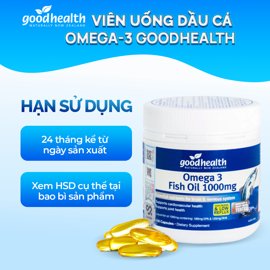 - Trẻ em trong giai đoạn phát triển. HƯỚNG DẪN SỬ DỤNG DẦU CÁ GOODHEALTH OMEGA 3 Người lớn: Uống 1-3 viên/ ngày cùng với bữa ăn hoặc theo lời khuyên của chuyên gia. Trẻ em (từ 2 - 12 tuổi): Uống 1-2 viên/ ngày cùng với bữa ăn hoặc theo lời khuyên của chuyên gia. Đối với trẻ dưới 5 tuổi, nên cắt nhỏ viên nang và cho vào thức ăn để tránh nguy cơ bị hóc. Nên uống ngay sau khi ăn, vì thức ăn giúp hấp thu Omega 3 tốt hơn. Hoặc người sử dụng có thể trộn cùng với thức ăn. Khuyến cáo: Không uống vượt quá liều dùng hàng ngày được khuyến cáo. Không sử dụng nếu mẫn cảm với thành phần của sản phẩm. NHẬN DIỆN HÀNG CHÍNH HÃNG Thực phẩm bảo vệ sức khỏe Omega 3 Fish Oil 1000mg được nhập khẩu trực tiếp từ Goodhealth New Zealand. Sản phẩm được phân phối chính hãng tại Việt Nam bởi Công ty TNHH HealthSK. Tem QR code Khi mua hộp Good Health Omega 3 Fish Oil 1000mg, bạn hãy cào lớp phủ bạc trên tem QR code để lấy mã QR hoặc mã bảo mật. Nhờ đó, bạn có thể xác thực thông tin về sản phẩm bằng cách: Soạn tin nhắn theo cú pháp: XT_Mã bảo mật và gửi 7039 (1000đ/ tin nhắn) Tải App Goodhealth G+ trên smartphone để quét mã QR. Tem nhãn phụ Trên mỗi hộp Good Health Omega 3 Fish Oil 1000mg đều có 1 tem nhãn phụ bằng tiếng Việt được thiết kế rõ ràng và in trên giấy chất liệu dày dặn, trắng sáng, chữ màu xanh đậm, rõ nét. Tem nhãn phụ có ghi đầy đủ nội dung bao gồm: tên đầy đủ của sản phẩm, thành phần, công dụng, đối tượng sử dụng, cách dùng… Tem chống hàng giả Trên mỗi vỏ hộp Good Health Omega 3 Fish Oil 1000mg đều có dán 1 tem chống hàng giả hologram (hay còn gọi là tem 7 màu). Tem có hình bầu dục, in chữ Goodhealth – Naturally New Zealand, khi nhìn dưới ánh sáng có phản quang óng ánh. Mã vạch Bạn có biết các sản phẩm chính hãng được nhập khẩu nguyên hộp từ New Zealand có mã vạch bắt đầu từ 940 – 949. Vì vậy, khi cầm hộp sản phẩm Goodhealth Omega 3 Fish Oil 1000mg chính hàng trên tay, bạn sẽ thấy mã vạch bắt đầu là 940 hoặc 949, mã vạch rõ ràng, không bị nhòe hoặc mờ. BẢO QUẢN Nơi khô ráo, thoáng mát, tránh ánh sáng trực tiếp, nhiệt độ dưới 30°C THỜI HẠN SỬ DỤNG : 08/2027 BATCH - T24J 36 tháng kể từ ngày sản xuất Hạn sử dụng ghi trên bao bì Sản phẩm này không phải là thuốc và không có tác dụng thay thế thuốc chữa bệnh.