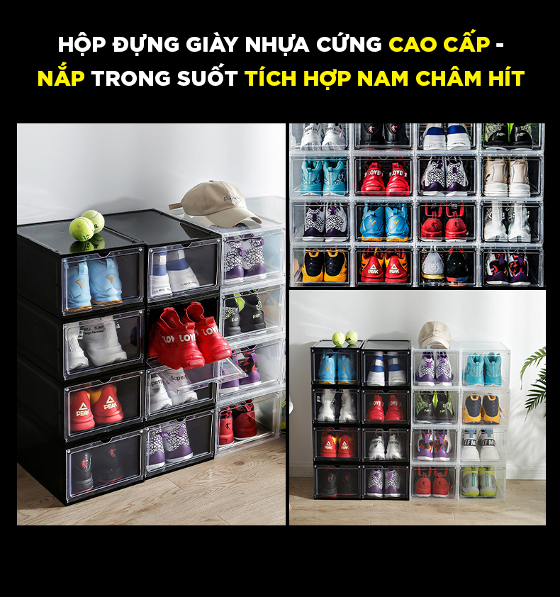 Hộp Đựng Giày Sneaker Thể Thao Nhựa Cao Cấp Nắp Cứng Trong Suốt Có Nam Châm Hít Và Cửa Gài sẽ là phương án tối ưu nhất.