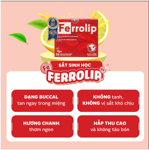 - Ferrolip đạt những tiêu chuẩn chất lượng khắt khe từ các tổ chức Quốc tế, đảm bảo chất lượng, an toàn, hiệu quả cho người thiếu máu thiếu sắt, đặc biệt là mẹ bầu và mẹ sau sinh. 5 lý do các chuyên gia khuyên dùng sắt Ferrolip – Sắt sinh học Hiệu quả của sắt sinh học Ferrolip Theo kết quả nghiên cứu của Noboru Sakaguchi và cộng sự tháng 1/2004: Sắt vi bao liposome có khả năng hấp thu cao hơn 4,7 lần so với sắt hữu cơ truyền thống (sắt Fumarate)! Từ đó có thể nhận định rằng: Sắt vi bao liposome (hay còn gọi là sắt sinh học) bổ sung sắt tốt hơn, cải thiện tình trnagj thiếu sắt thiếu máu hiệu quả hơn và hạn chế tối đa các tác dụng phụ như nóng trong, táo bón. An toàn Sắt Ferrolip sử dụng được cho người lớn, phụ nữ mang thai, phụ nữ nuôi con bú, nữ giới trong thời kỳ kinh nguyệt có nhu cầu bổ sung sắt. Sản phẩm với công nghệ màng bao liposome bao bọc lấy phân tử sắt giúp hạn chế được các tác dụng phụ như: Táo bón, nóng trong, kích ứng tiêu hóa; hoàn toàn không có vị tanh của sắt, thay vào đó là vị chua ngọt nhẹ và hương thơm của chanh. Lưu ý: Đối với trẻ dưới 6 tuổi cần tham khảo ý kiến của bác sĩ trước khi sử dụng sản phẩm Ferrolip. Tiện lợi Sản phẩm được chia thành các gói nhỏ cực kỳ tiện dụng có thể mang đi xa. Sắt dạng bột buccal tan ngay trong miệng có thể sử dụng trực tiếp mà không cần phải pha với nước. Dễ sử dụng Sắt Ferrolip không tanh, hương chanh thanh mát, dễ uống, có thể sử dụng ngay mà không cần pha với nước. Có nguồn gốc, xuất xứ rõ ràng Sắt sinh học Ferrolip được nhập khẩu từ Italy, được tin dùng tại hơn 20 quốc gia trên thế giới, đặc biệt là các quốc gia có nền y tế hiện đại như Anh, Úc, Nhật…Tại Việt Nam, sản phẩm được Bộ Y tế cấp phép lưu hành toàn quốc, nhập khẩu và phân phối độc quyền bởi Công ty TNHH Dược Hunmed, được kiểm soát khắt khe để đảm bảo sản phẩm chính hãng, chất lượng. Đối tượng sử dụng Ferrolip, thành phần và công dụng Đối tượng sử dụng Ferrolip